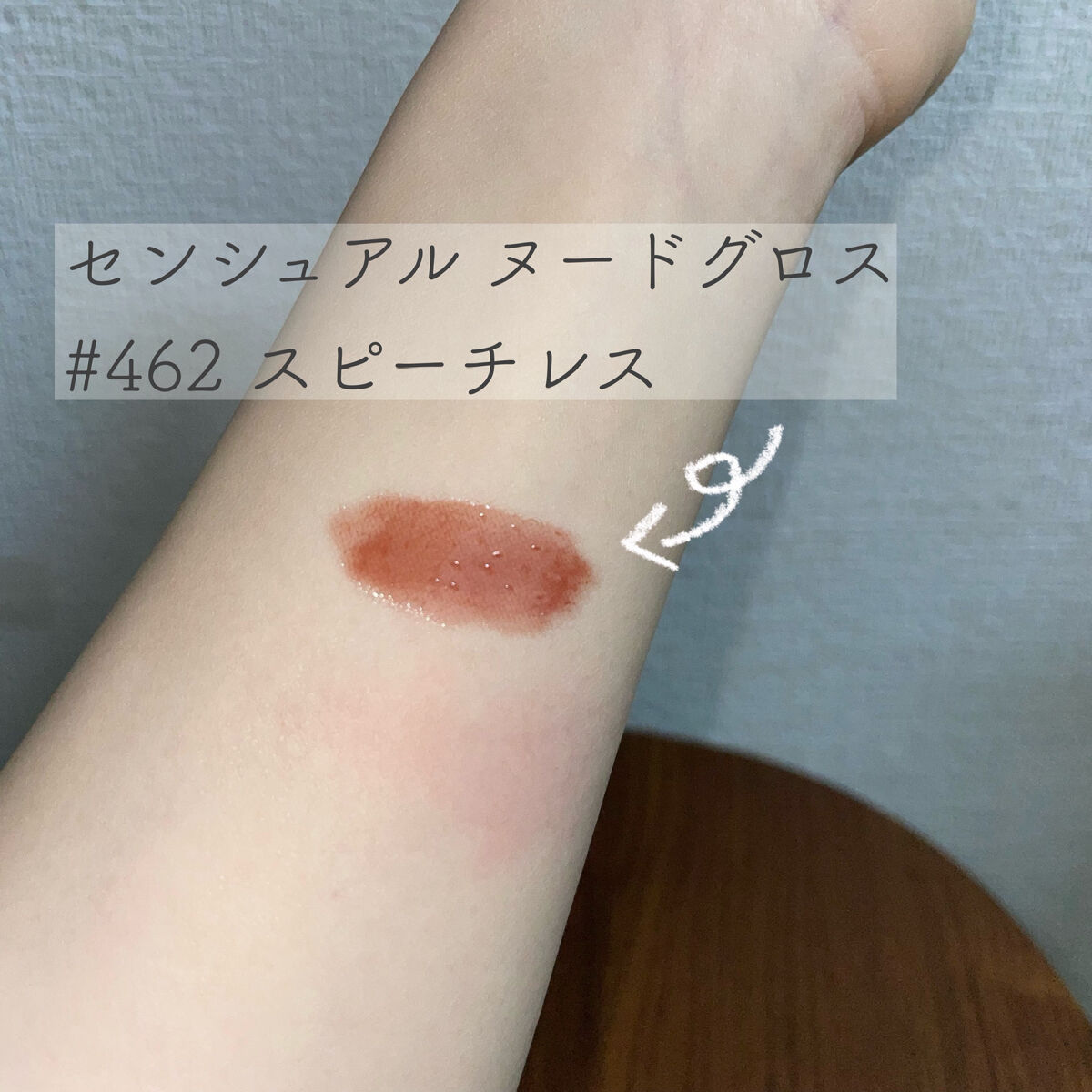 ツヤ感リップグロス 心地よい密着感 薄付きカラー #462のカラーは単体で見るとブラウン感が強いのですが、他のリップに重ね塗りすると程よく落ち着いたトーンの唇になるので、使いやすかったです! ヒリヒリ感やベタベタ感はそこまで感じませんでした。 ベタベタしてマスクや髪に付く感じが苦手でグロス系があまり得意ではなかったのですが、このリップグロスは時間が経つとしっかり密着してくれるので、あまり気にならないと思います☺️ ぜひ他の色も試してみたいリップです✨