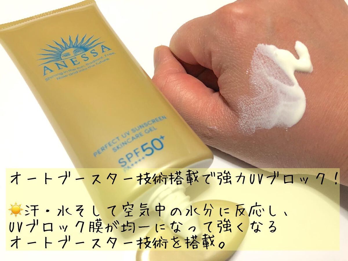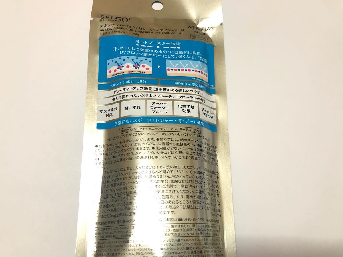 - SPF50+ ・ PA++++ 顔・ から だ用 汗、水、そして空気中の水分※10 に反応してUVブロック膜が強くなる技術搭載 毎日つけたくなる みずみずしいスキンケア UVジェル ※10 暑い時期の高湿度環境 〇汗、水、そして空気中の水分に自動的に反応して 、 UVブロック膜が 強くなります 。-オートブースタ ー 技術 〇透明美肌仕上げ-ビューティ ー アップ 〇スキンケア成分50%配合 〇保湿成分:コラーゲン、スーパーヒアルロン酸※9、グリセリン ※9 アセチルヒアルロン酸Na 〇長時間保湿持続効果 〇スーパーウォータープルーフ 〇マスク蒸れ対応 〇耐こすれ 〇化粧下地効果 〇せっけんで落とせる 〇みずみずしいジェル 〇生まれ変わった、心地よいフルーティーフローラルの香り 〇大気中に浮遊する微粒子、PM2.5などから肌を保護します。 -微粒子付着防止対応 〇海に流れ出にくいオーシャンフレンドリー処方※6 ※6 自社品内の耐水処方でない商品と比較 〇植物由来の原料を一部使用した袋 〇無着色・ノンコメドジェニックテスト・アレルギーテスト済み (全ての方にニキビができない、アレルギーが起きないというわけではありません)