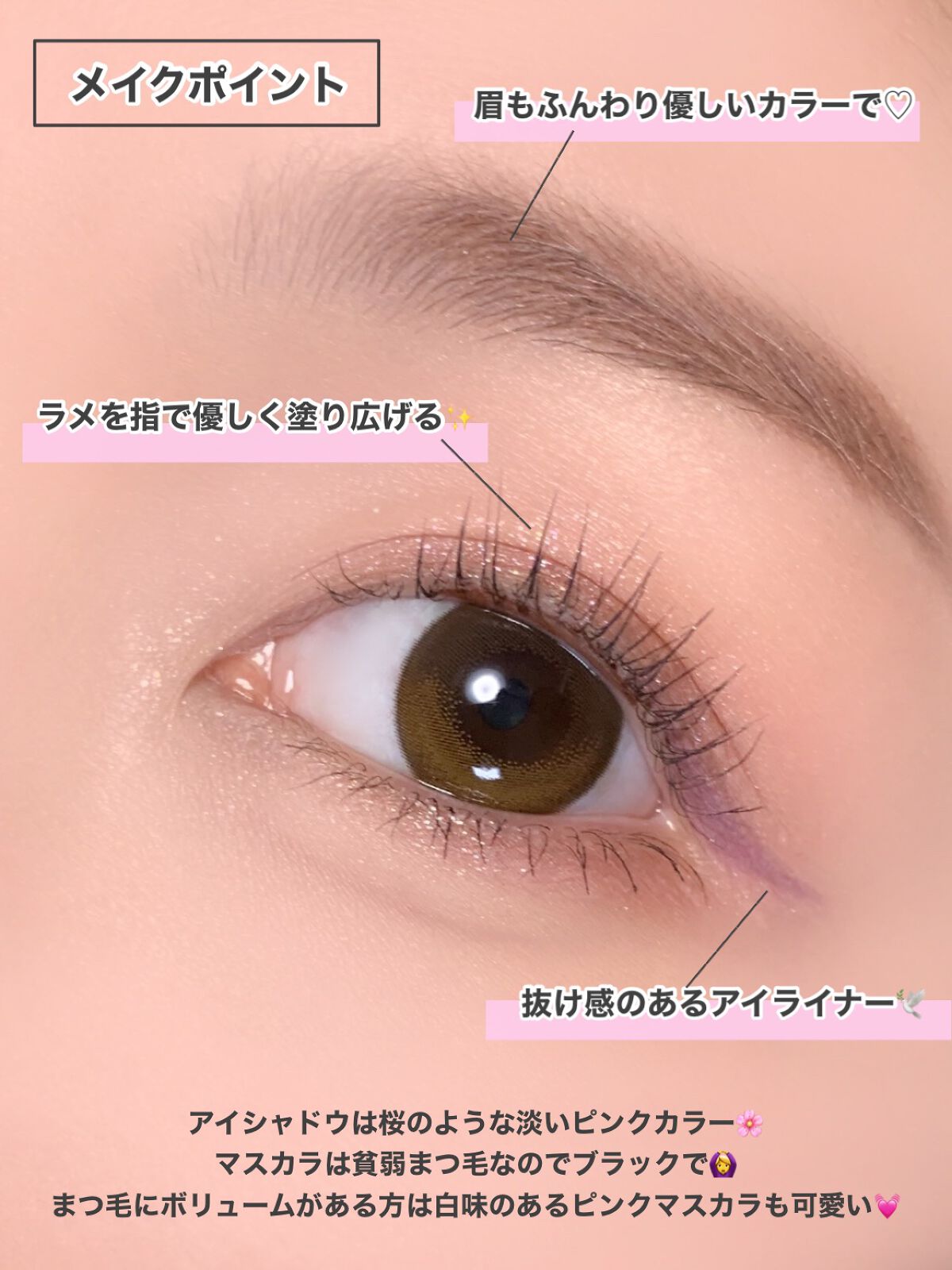涙袋の影をアイライナーで描いたあと、アイブロウパウダーでぼかすのがナチュラルな涙袋を作る秘訣です☺️ アイライナーは明るいブラウン系、マスカラは赤みブラウンを使って柔らかい雰囲気にしました♡ カラコンは、ワンデー アキュビュー® ディファイン® モイスト® <フレッシュ シリーズ>のフレッシュ ハニーを使用しました💗 ナチュラルかつ印象的な瞳になれます✨