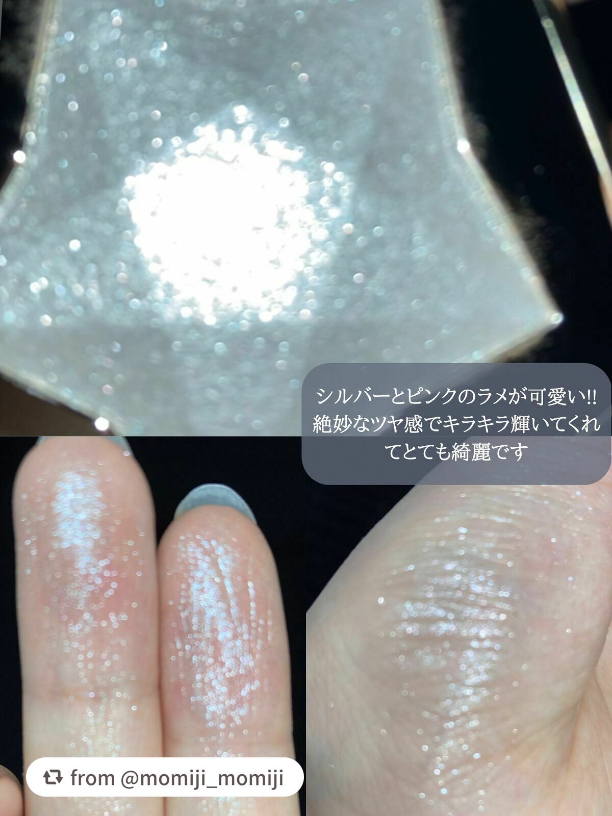 - 「ダイヤモンドのような輝き」天の川のように輝く、透明感と輝きに優れた真珠のような光沢。 複数のファインダイヤモンドの輝きを再現 <01 シルバーホワイト> シルバーホワイトのカラーが美しく輝いてツヤと透明感をプラス。なめらかでモチっとしたテクスチャーと小粒のラメが美しいツヤ肌を演出。Tゾーンや頬骨、デコルテなど光を与えたい部分に塗ればダイアモンドのように輝く。 <02 ライトシャンパン> ライトシャンパンのカラーが血色感と自然な光沢感をプラス。なめらかでモチっとしたテクスチャーと小粒のラメが美しいツヤ肌を演出。Tゾーンや頬骨、デコルテなど光を与えたい部分に塗ればダイアモンドのように輝く。 <03 シャンパンゴールド> シャンパンゴールドのカラーが表情を華やかに引き立てる。なめらかでモチっとしたテクスチャーと小粒のラメが美しいツヤ肌を演出。Tゾーンや頬骨、デコルテなど光を与えたい部分に塗ればダイアモンドのように輝く。 <05 シャンパンピンク> シャンパンピンクのカラーが血色感と透明感を与える。チークに重ねればピンクが引き立つ!なめらかでモチっとしたテクスチャーと小粒のラメが美しいツヤ肌を演出。Tゾーンや頬骨、デコルテなど光を与えたい部分に塗ればダイアモンドのように輝く。 <N01 シルバーホワイト> シルバーカラーのきらめきで、一瞬で透明感ある印象に。 小粒パール+大粒グリッターの組み合わせが、星屑のように繊細かつ大胆に煌めいてワンランク上のメイクに仕上げる。なめらか&モチっとした使用感で肌に高密着。 光を反射させる高屈折オイル配合でどの角度でもツヤ肌を実現。 鼻・頬・目頭・眉下以外にも、肩やデコルテに仕込めばお顔のツヤとリンクして、内から輝くような自然な印象に。 <N02 ライトシャンパン> ライトシャンパンのカラーが肌の色に自然になじみながら、ほどよいツヤと立体感をプラス。 小粒パール+大粒グリッターの組み合わせが、星屑のように繊細かつ大胆に煌めいてワンランク上のメイクに仕上げる。 なめらか&モチっとした使用感で肌に高密着。光を反射させる高屈折オイル配合でどの角度でもツヤ肌を実現。 鼻・頬・目頭・眉下以外にも、肩やデコルテに仕込めばお顔のツヤとリンクして、内から輝くような自然な印象に。 <N07 ネビュラブルー 日本限定色> ブルーとパープルの大粒ラメと、細かいシルバーラメが混ぜ合わさって色白な肌にツヤ感を与えてより明るく見せることができる! <N08 ネビュラパープル 日本限定色> パープルとピンク色の大粒ラメと、細かいシルバーラメが混ぜ合わさって、どのような肌色にもぴったり!かわいらしい雰囲気が作れる。