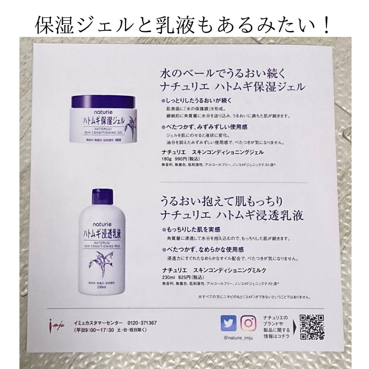 ハトムギエキス20%増量で保湿力UP →天然植物由来の保湿成分ハトムギエキスを従来品より20%増量 アルコールフリーに →毎日快適に使いやすいアルコールフリーになった テクスチャーはみずみずしくベタつかない 肌にスーッと馴染んでくれる