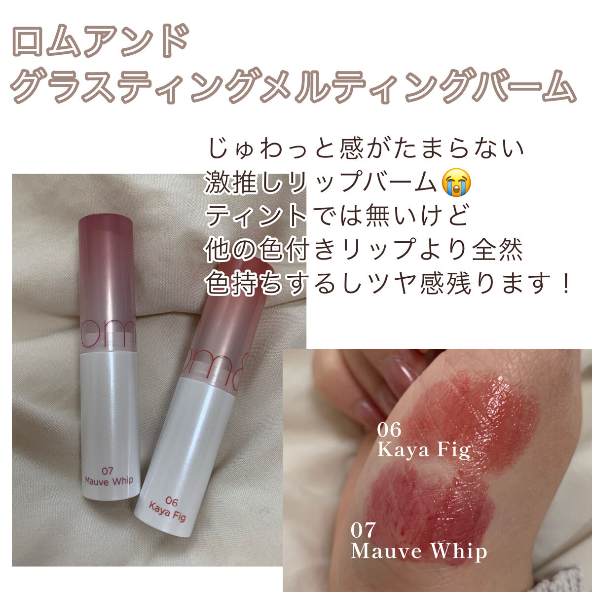 ロムアンドの新作のリップバームが可愛すぎて ティント効果は無いみたいだけど、バームとは思えないほどしっかり発色するし割と色残ります◎ 保湿力が高いので、塗り直しても潤い続いて じゅわっとむっちりな唇にしてくれます👏🏻