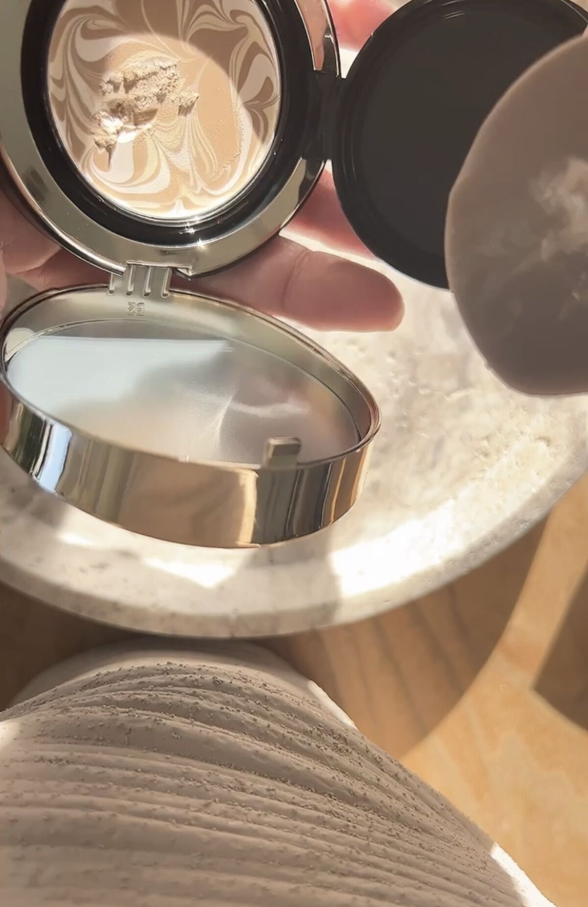 美しいマーブル模様が麗しく 黒とゴールドのファビュラスなパケに、テンション⤴︎⤴︎あがりまくりなんです。 柔らかいバームのようなテクスチャーと、もちもちしたパフが肌の表面の凹凸をしっかりキャッチ。 顔が乾燥しないのが嬉しい。私の一軍コスメに決定!