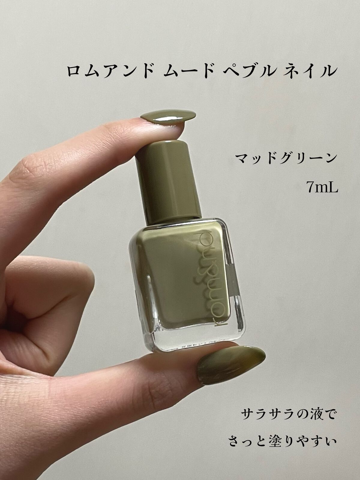 - 指先に玉石のような、ならかな光沢をとどめる。塗った瞬間から綺麗なツヤと光沢を維持し、重ねて塗っても透き通ったカラー感を鮮やかにとどめる、素早い乾燥力のナチュラルカラーネイル。「ロムアンド」の次世代型ネイルです。