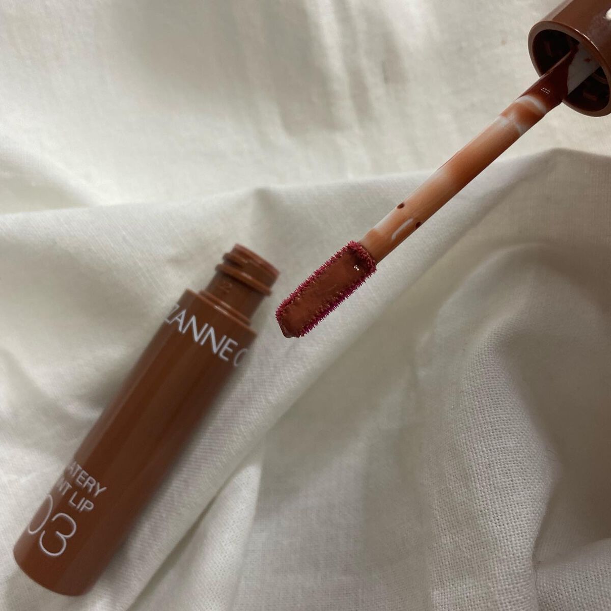 CEZANNEさんのウォータリーティントリップ初体験🧏🏻♀️💕08カフェブラウン☕✧イエベもブルベもどっちも似合いそうな色で大人可愛い❕👩🏻結構ブラウン味が強い感じがありますが、付けてみると元の唇の色と混ざって赤みブラウンになります🫶オイル...