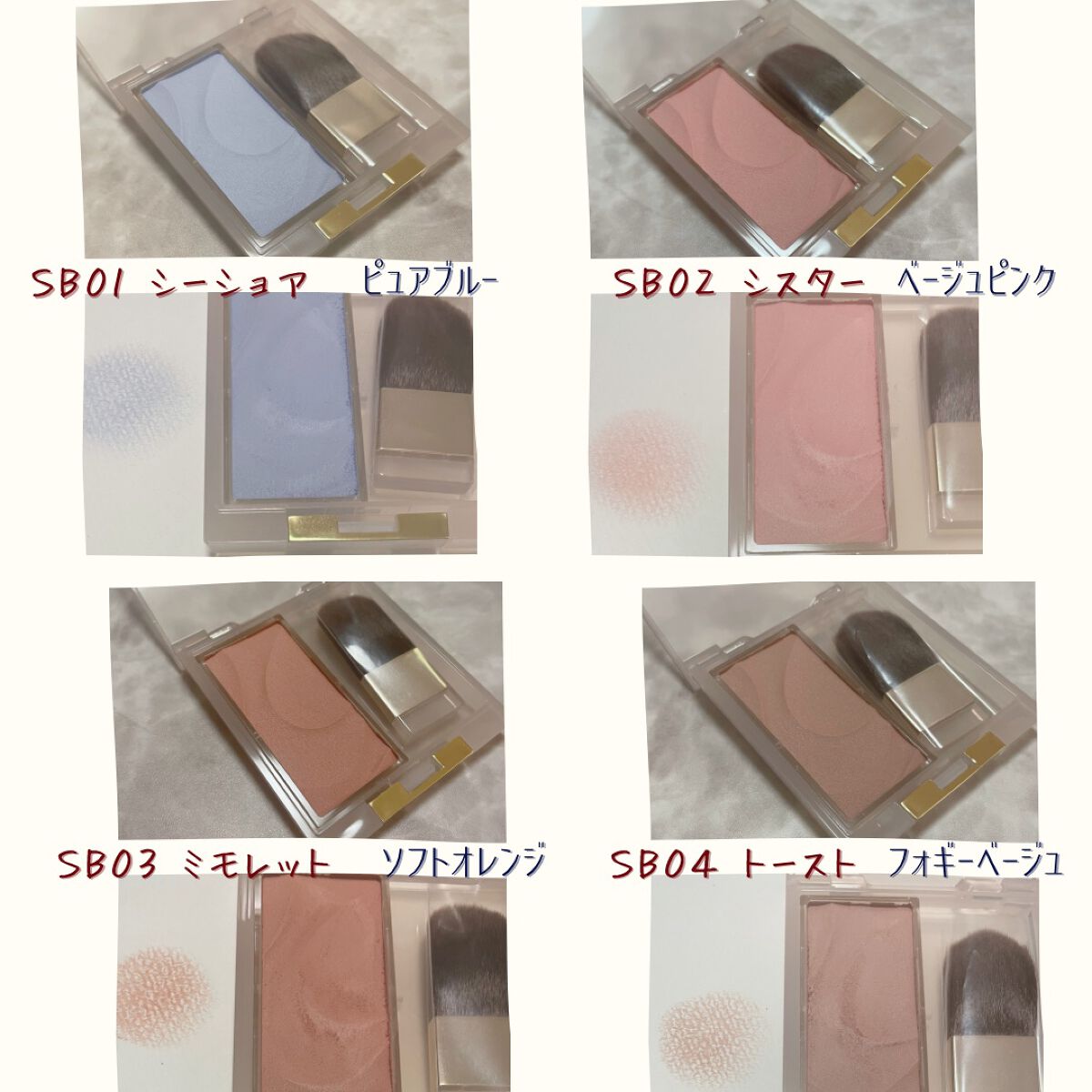 - <SB01 シーショア> タルク、トリエチルヘキサノイン、窒化ホウ素、ポリグリセリル-3ポリジメチルシロキシエチルジメチコン、ラウリン酸亜鉛、トリメチルシロキシケイ酸、メチルトリメチコン、ステアリン酸ソルビタン、セラミドNP、スクワラン、ホホバ種子油、オリーブ果実油、トコフェロール、メチルパラベン、(+/-)グンジョウ、マイカ、酸化チタン、酸化鉄、水酸化Al、赤202、赤226 <SB02 シスター> タルク、トリエチルヘキサノイン、窒化ホウ素、ポリグリセリル-3ポリジメチルシロキシエチルジメチコン、ラウリン酸亜鉛、トリメチルシロキシケイ酸、メチルトリメチコン、ステアリン酸ソルビタン、セラミドNP、スクワラン、ホホバ種子油、オリーブ果実油、トコフェロール、メチルパラベン、(+/-)グンジョウ、マイカ、酸化チタン、酸化鉄、水酸化Al、赤202、赤226 <SB03 ミモレット> タルク、トリエチルヘキサノイン、窒化ホウ素、ポリグリセリル-3ポリジメチルシロキシエチルジメチコン、ラウリン酸亜鉛、トリメチルシロキシケイ酸、メチルトリメチコン、ステアリン酸ソルビタン、セラミドNP、スクワラン、ホホバ種子油、オリーブ果実油、トコフェロール、メチルパラベン、(+/-)グンジョウ、マイカ、酸化チタン、酸化鉄、水酸化Al、赤202、赤226 <SB04 トースト> タルク、トリエチルヘキサノイン、窒化ホウ素、ポリグリセリル-3ポリジメチルシロキシエチルジメチコン、ラウリン酸亜鉛、トリメチルシロキシケイ酸、メチルトリメチコン、ステアリン酸ソルビタン、セラミドNP、スクワラン、ホホバ種子油、オリーブ果実油、トコフェロール、メチルパラベン、(+/-)グンジョウ、マイカ、酸化チタン、酸化鉄、水酸化Al、赤202、赤226 <SB05 ワルツ(限定)> タルク、トリエチルヘキサノイン、ステアリン酸ソルビタン、窒化ホウ素、ポリグリセリル-3ポリジメチルシロキシエチルジメチコン、ラウリン酸亜鉛、トリメチルシロキシケイ酸、メチルトリメチコン、セラミドNP、スクワラン、ホホバ種子油、オリーブ果実油、トコフェロール、メチルパラベン、(+/-)グンジョウ、ホウケイ酸(Ca/Al)、マイカ、金、酸化チタン、酸化鉄、水酸化Al、赤226 <SB06 オーケストラ(限定)> タルク、トリエチルヘキサノイン、ステアリン酸ソルビタン、窒化ホウ素、ポリグリセリル-3ポリジメチルシロキシエチルジメチコン、ラウリン酸亜鉛、トリメチルシロキシケイ酸、メチルトリメチコン、セラミドNP、スクワラン、ホホバ種子油、オリーブ果実油、トコフェロール、メチルパラベン、(+/-)グンジョウ、ホウケイ酸(Ca/Al)、マイカ、金、酸化チタン、酸化鉄、水酸化Al、赤226