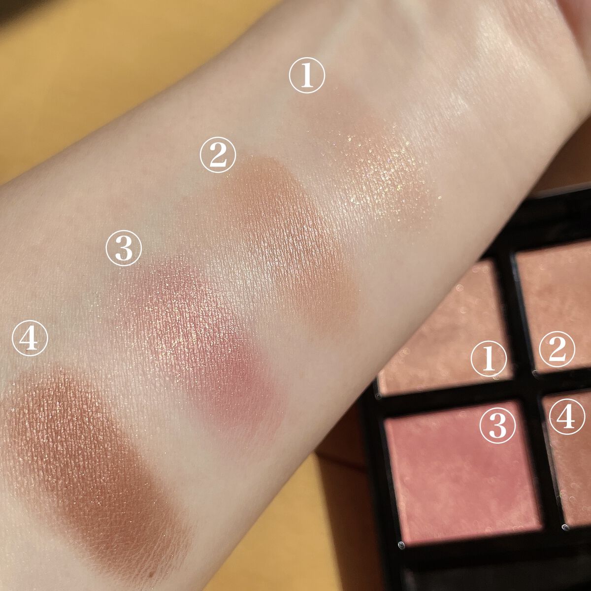 ジューシー発色なパレットです✨ この左上のスパークルがこのパレットを「無難」ではない 「ちょっと攻めた」夏のかわいさ(語彙力…)のある パレットにしてくれてる気がします🤭✨ ソフトな発色のベージュピンク シアーなコーラルオレンジ(サーモンピンク、というよりコーラルオレンジ、という印象🤔) 偏光カラーのパール入り 目元にのせてみるとパレットで見た印象より 青み感がなく、イエベの私も使いやすい印象でした。 このカラーを使うと一気に深みが。 使わなければ全体的にコーラルオレンジ感が出て、 よりジューシーで夏らしい感じに✨