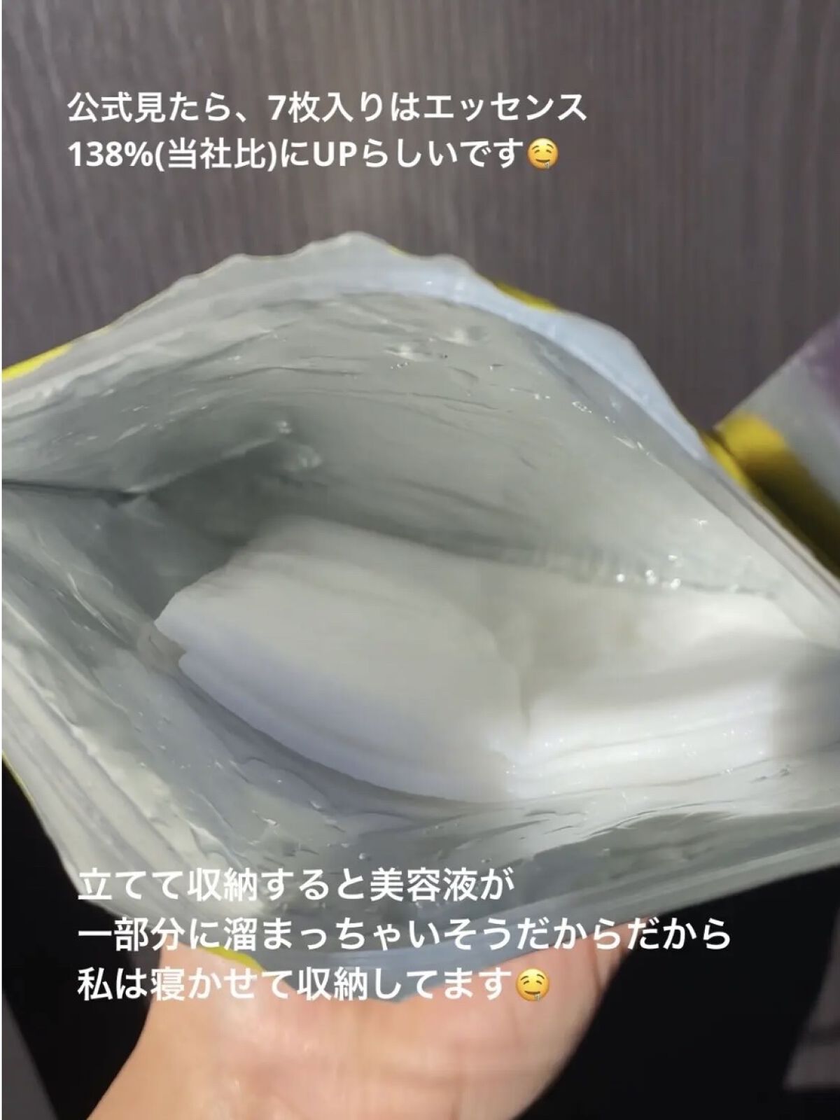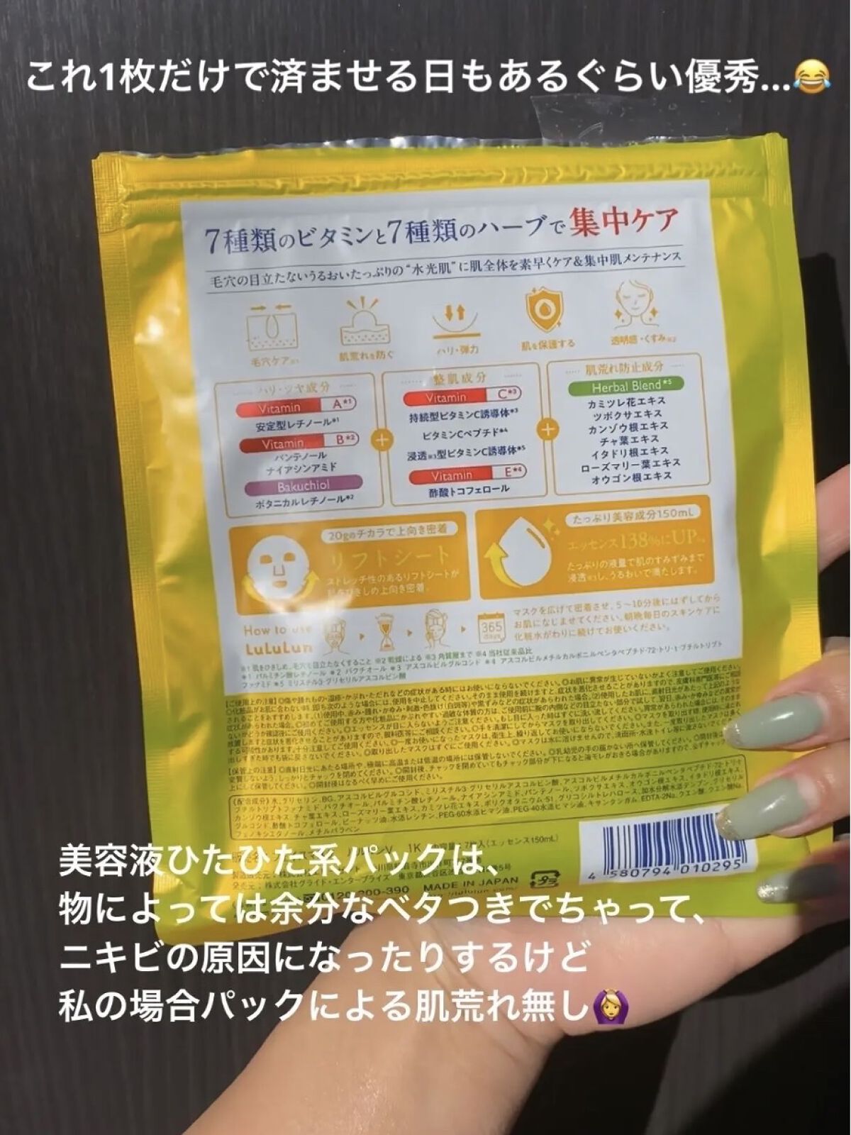 たっぷり美容成分150ml! 毛穴の目立たないうるおいたっぷりの水光肌に✨ 7種類のビタミンと7種類のハーブで集中ケア。新開発のハイフ感覚シートでリフトアップしながら、肌のすみずみまでうるおいで満たします。 柔らかいシートにエッセンスがたっぷり✨ 密着感あります。鼻のあたりも大きめでゆったり。
