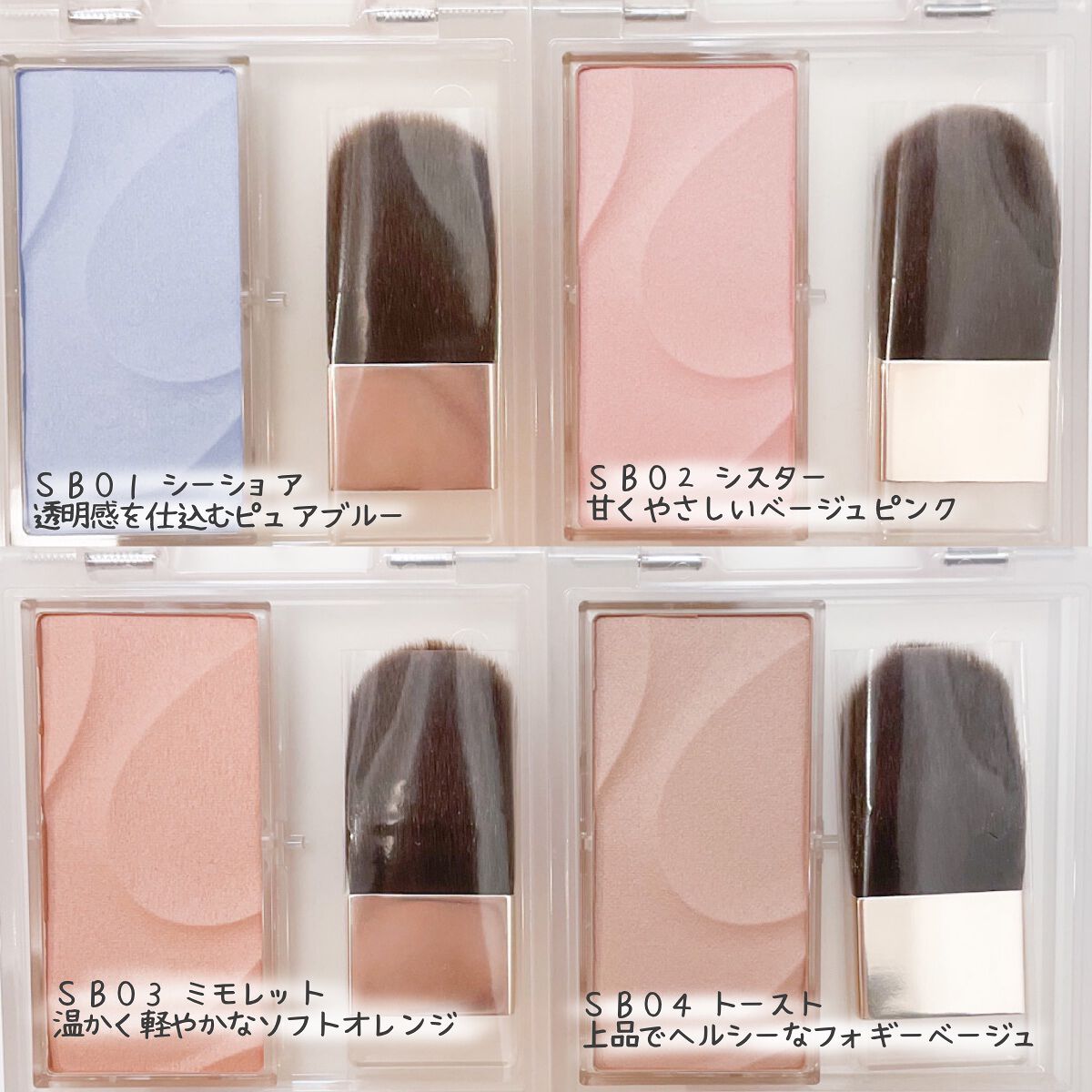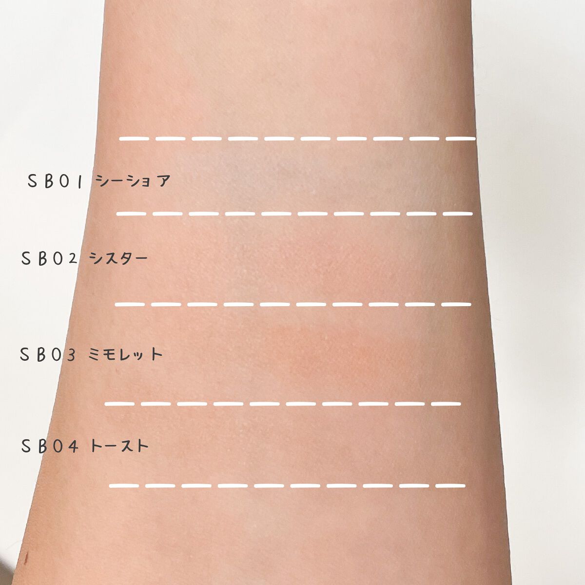 - <SB01 シーショア> タルク、トリエチルヘキサノイン、窒化ホウ素、ポリグリセリル-3ポリジメチルシロキシエチルジメチコン、ラウリン酸亜鉛、トリメチルシロキシケイ酸、メチルトリメチコン、ステアリン酸ソルビタン、セラミドNP、スクワラン、ホホバ種子油、オリーブ果実油、トコフェロール、メチルパラベン、(+/-)グンジョウ、マイカ、酸化チタン、酸化鉄、水酸化Al、赤202、赤226 <SB02 シスター> タルク、トリエチルヘキサノイン、窒化ホウ素、ポリグリセリル-3ポリジメチルシロキシエチルジメチコン、ラウリン酸亜鉛、トリメチルシロキシケイ酸、メチルトリメチコン、ステアリン酸ソルビタン、セラミドNP、スクワラン、ホホバ種子油、オリーブ果実油、トコフェロール、メチルパラベン、(+/-)グンジョウ、マイカ、酸化チタン、酸化鉄、水酸化Al、赤202、赤226 <SB03 ミモレット> タルク、トリエチルヘキサノイン、窒化ホウ素、ポリグリセリル-3ポリジメチルシロキシエチルジメチコン、ラウリン酸亜鉛、トリメチルシロキシケイ酸、メチルトリメチコン、ステアリン酸ソルビタン、セラミドNP、スクワラン、ホホバ種子油、オリーブ果実油、トコフェロール、メチルパラベン、(+/-)グンジョウ、マイカ、酸化チタン、酸化鉄、水酸化Al、赤202、赤226 <SB04 トースト> タルク、トリエチルヘキサノイン、窒化ホウ素、ポリグリセリル-3ポリジメチルシロキシエチルジメチコン、ラウリン酸亜鉛、トリメチルシロキシケイ酸、メチルトリメチコン、ステアリン酸ソルビタン、セラミドNP、スクワラン、ホホバ種子油、オリーブ果実油、トコフェロール、メチルパラベン、(+/-)グンジョウ、マイカ、酸化チタン、酸化鉄、水酸化Al、赤202、赤226 <SB05 ワルツ(限定)> タルク、トリエチルヘキサノイン、ステアリン酸ソルビタン、窒化ホウ素、ポリグリセリル-3ポリジメチルシロキシエチルジメチコン、ラウリン酸亜鉛、トリメチルシロキシケイ酸、メチルトリメチコン、セラミドNP、スクワラン、ホホバ種子油、オリーブ果実油、トコフェロール、メチルパラベン、(+/-)グンジョウ、ホウケイ酸(Ca/Al)、マイカ、金、酸化チタン、酸化鉄、水酸化Al、赤226 <SB06 オーケストラ(限定)> タルク、トリエチルヘキサノイン、ステアリン酸ソルビタン、窒化ホウ素、ポリグリセリル-3ポリジメチルシロキシエチルジメチコン、ラウリン酸亜鉛、トリメチルシロキシケイ酸、メチルトリメチコン、セラミドNP、スクワラン、ホホバ種子油、オリーブ果実油、トコフェロール、メチルパラベン、(+/-)グンジョウ、ホウケイ酸(Ca/Al)、マイカ、金、酸化チタン、酸化鉄、水酸化Al、赤226