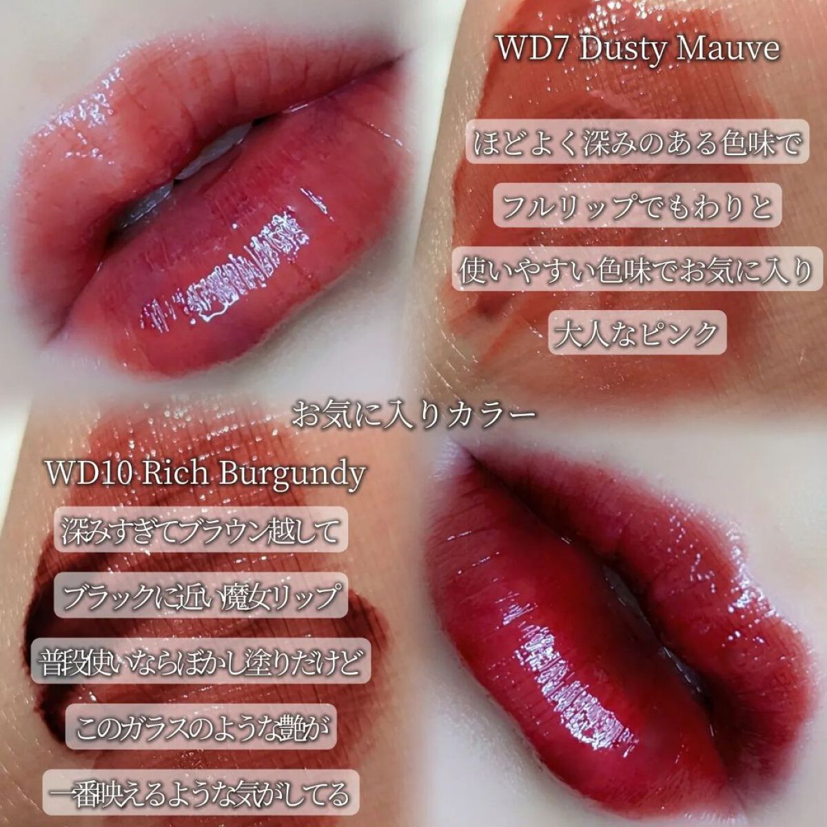 - <WD2 ビトゥン ローズ> 水、ジフェニルジメチコン、リンゴ酸ジイソステアリル、ビスジグリセリルポリアシルアジペート-2、水添ポリイソブテン、ジグリセリン、DPG、セチルPEG/PPG-10/1ジメチコン、イソステアリン酸ソルビタン、ポリソルベート60、ペンチレングリコール、オクチルドデカノール、セテアレス-20、(アクリル酸ヒドロキシエチル/アクリロイルジメチルタウリンNa)コポリマー、スクワラン、フェノキシエタノール、ポリグリセリン-3、ステビオシド、香料、エチルヘキシルグリセリン、グリセリン、シア脂、ツバキ種子油、トリ(カプリル酸/カプリン酸)グリセリル、アルガニアスピノサ核油、ホホバ種子油、アーモンド油、アンズ核油、月見草油、オリーブ果実油、テトラ(ジ-t-ブチルヒドロキシヒドロケイヒ酸)ペンタエリスリチル、カニナバラ果実エキス、マンゴー果実エキス、赤104(1)、赤227、黄5、青1 <WD3 ピンク ヘイズ> 水、ジフェニルジメチコン、リンゴ酸ジイソステアリル、ビスジグリセリルポリアシルアジペート-2、水添ポリイソブテン、ジグリセリン、DPG、セチルPEG/PPG-10/1ジメチコン、イソステアリン酸ソルビタン、ポリソルベート60、ペンチレングリコール、オクチルドデカノール、セテアレス-20、(アクリル酸ヒドロキシエチル/アクリロイルジメチルタウリンNa)コポリマー、スクワラン、フェノキシエタノール、ポリグリセリン-3、ステビオシド、香料、エチルヘキシルグリセリン、グリセリン、水酸化Al、ポリアクリル酸アンモニウム、BG、アルガニアスピノサ核油、シア脂、ツバキ種子油、トリ(カプリル酸/カプリン酸)グリセリル、アーモンド油、アンズ核油、ホホバ種子油、月見草油、オリーブ果実油、テトラ(ジ-t-ブチルヒドロキシヒドロケイヒ酸)ペンタエリスリチル、マンゴー果実エキス、カニナバラ果実エキス、酸化チタン、赤104(1)、赤227、黄5、青1 <WD4 オールウェイズ ヤング> 水、ジフェニルジメチコン、リンゴ酸ジイソステアリル、ビスジグリセリルポリアシルアジペート-2、水添ポリイソブテン、ジグリセリン、DPG、セチルPEG/PPG-10/1ジメチコン、イソステアリン酸ソルビタン、ポリソルベート60、ペンチレングリコール、オクチルドデカノール、セテアレス-20、(アクリル酸ヒドロキシエチル/アクリロイルジメチルタウリンNa)コポリマー、スクワラン、フェノキシエタノール、ポリグリセリン-3、ステビオシド、香料、エチルヘキシルグリセリン、グリセリン、シア脂、ツバキ種子油、トリ(カプリル酸/カプリン酸)グリセリル、アルガニアスピノサ核油、ホホバ種子油、アーモンド油、アンズ核油、月見草油、オリーブ果実油、テトラ(ジ-t-ブチルヒドロキシヒドロケイヒ酸)ペンタエリスリチル、カニナバラ果実エキス、マンゴー果実エキス、赤104(1)、赤227、黄5、青1 <WD6 クラッシュド パンプキン> 水、水添ポリイソブテン、リンゴ酸ジイソステアリル、ビスジグリセリルポリアシルアジペート-2、ジフェニルシロキシフェニルトリメチコン、ジフェニルジメチコン、ポリグリセリン-3、オクチルドデカノール、ポリソルベート60、セチルPEG/PPG-10/1ジメチコン、ラウリン酸ポリグリセリル-10、ペンチレングリコール、1,2-ヘキサンジオール、(アクリル酸ヒドロキシエチル/アクリロイルジメチルタウリンNa)コポリマー、PEG-60水添ヒマシ油、セテアリルアルコール、スクワラン、キシリトール、エチルヘキシルグリセリン、香料、ポリアクリル酸アンモニウム、イソステアリン酸ソルビタン、水酸化Al、フェノキシエタノール、BG、トコフェロール、酸化チタン、酸化鉄、赤227、黄4、黄5、青1 <WD8 ビンテージ カラント> 水、水添ポリイソブテン、リンゴ酸ジイソステアリル、ビスジグリセリルポリアシルアジペート-2、ジフェニルシロキシフェニルトリメチコン、ジフェニルジメチコン、オクチルドデカノール、ポリグリセリン-3、ポリソルベート60、セチルPEG/PPG-10/1ジメチコン、ラウリン酸ポリグリセリル-10、1,2-ヘキサンジオール、ペンチレングリコール、(アクリル酸ヒドロキシエチル/アクリロイルジメチルタウリンNa)コポリマー、PEG-60水添ヒマシ油、セテアリルアルコール、スクワラン、キシリトール、エチルヘキシルグリセリン、香料、イソステアリン酸ソルビタン、トコフェロール、赤104(1)、赤227、黄5、青1 <WD9 ミスター ストレンジャー> 水、水添ポリイソブテン、リンゴ酸ジイソステアリル、ビスジグリセリルポリアシルアジペート-2、ジフェニルシロキシフェニルトリメチコン、ジフェニルジメチコン、オクチルドデカノール、ポリグリセリン-3、ポリソルベート60、セチルPEG/PPG-10/1ジメチコン、ラウリン酸ポリグリセリル-10、1,2-ヘキサンジオール、ペンチレングリコール、(アクリル酸ヒドロキシエチル/アクリロイルジメチルタウリンNa)コポリマー、セテアリルアルコール、PEG-60水添ヒマシ油、スクワラン、キシリトール、エチルヘキシルグリセリン、香料、イソステアリン酸ソルビタン、水酸化Al、ポ