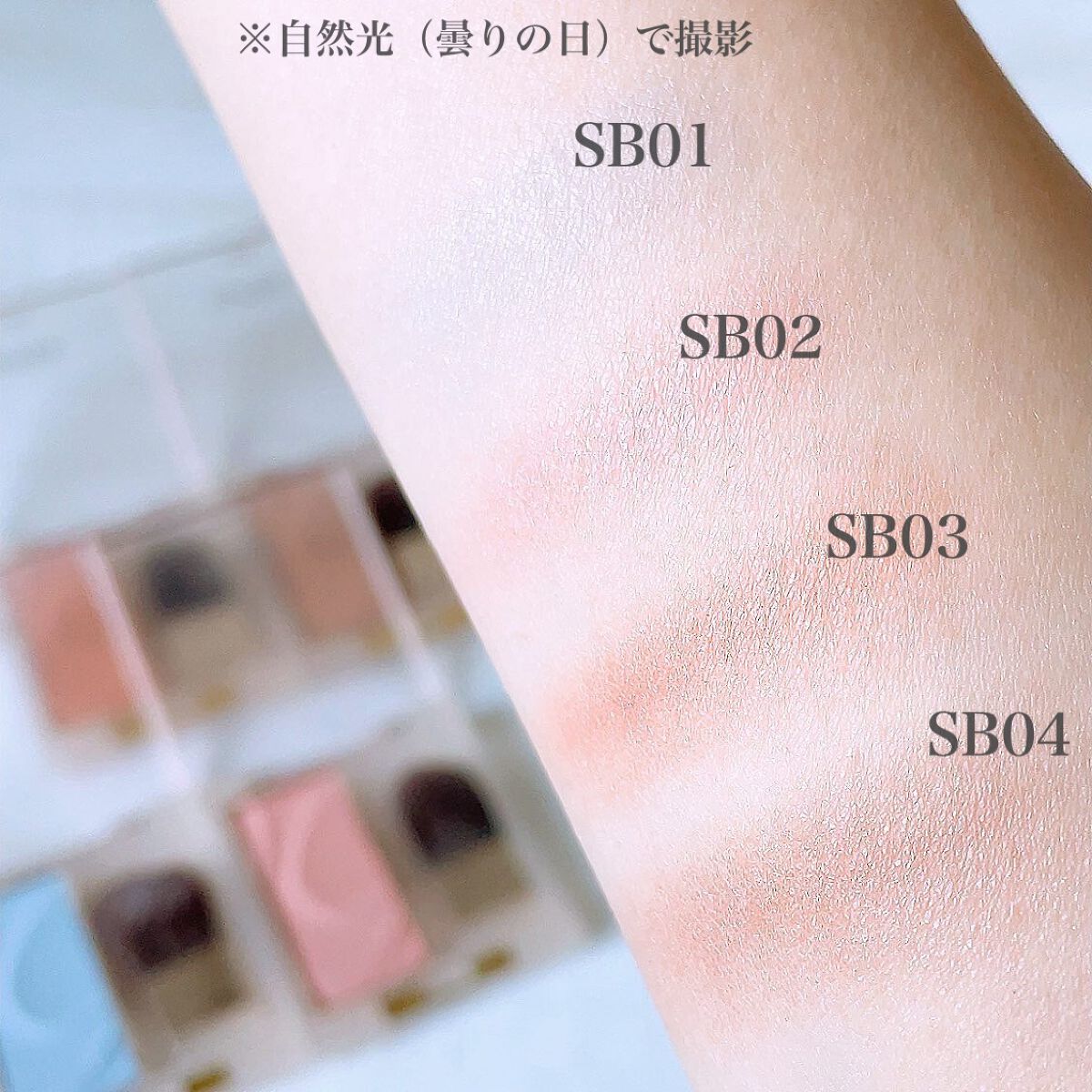 - <SB01 シーショア> タルク、トリエチルヘキサノイン、窒化ホウ素、ポリグリセリル-3ポリジメチルシロキシエチルジメチコン、ラウリン酸亜鉛、トリメチルシロキシケイ酸、メチルトリメチコン、ステアリン酸ソルビタン、セラミドNP、スクワラン、ホホバ種子油、オリーブ果実油、トコフェロール、メチルパラベン、(+/-)グンジョウ、マイカ、酸化チタン、酸化鉄、水酸化Al、赤202、赤226 <SB02 シスター> タルク、トリエチルヘキサノイン、窒化ホウ素、ポリグリセリル-3ポリジメチルシロキシエチルジメチコン、ラウリン酸亜鉛、トリメチルシロキシケイ酸、メチルトリメチコン、ステアリン酸ソルビタン、セラミドNP、スクワラン、ホホバ種子油、オリーブ果実油、トコフェロール、メチルパラベン、(+/-)グンジョウ、マイカ、酸化チタン、酸化鉄、水酸化Al、赤202、赤226 <SB03 ミモレット> タルク、トリエチルヘキサノイン、窒化ホウ素、ポリグリセリル-3ポリジメチルシロキシエチルジメチコン、ラウリン酸亜鉛、トリメチルシロキシケイ酸、メチルトリメチコン、ステアリン酸ソルビタン、セラミドNP、スクワラン、ホホバ種子油、オリーブ果実油、トコフェロール、メチルパラベン、(+/-)グンジョウ、マイカ、酸化チタン、酸化鉄、水酸化Al、赤202、赤226 <SB04 トースト> タルク、トリエチルヘキサノイン、窒化ホウ素、ポリグリセリル-3ポリジメチルシロキシエチルジメチコン、ラウリン酸亜鉛、トリメチルシロキシケイ酸、メチルトリメチコン、ステアリン酸ソルビタン、セラミドNP、スクワラン、ホホバ種子油、オリーブ果実油、トコフェロール、メチルパラベン、(+/-)グンジョウ、マイカ、酸化チタン、酸化鉄、水酸化Al、赤202、赤226 <SB05 ワルツ(限定)> タルク、トリエチルヘキサノイン、ステアリン酸ソルビタン、窒化ホウ素、ポリグリセリル-3ポリジメチルシロキシエチルジメチコン、ラウリン酸亜鉛、トリメチルシロキシケイ酸、メチルトリメチコン、セラミドNP、スクワラン、ホホバ種子油、オリーブ果実油、トコフェロール、メチルパラベン、(+/-)グンジョウ、ホウケイ酸(Ca/Al)、マイカ、金、酸化チタン、酸化鉄、水酸化Al、赤226 <SB06 オーケストラ(限定)> タルク、トリエチルヘキサノイン、ステアリン酸ソルビタン、窒化ホウ素、ポリグリセリル-3ポリジメチルシロキシエチルジメチコン、ラウリン酸亜鉛、トリメチルシロキシケイ酸、メチルトリメチコン、セラミドNP、スクワラン、ホホバ種子油、オリーブ果実油、トコフェロール、メチルパラベン、(+/-)グンジョウ、ホウケイ酸(Ca/Al)、マイカ、金、酸化チタン、酸化鉄、水酸化Al、赤226