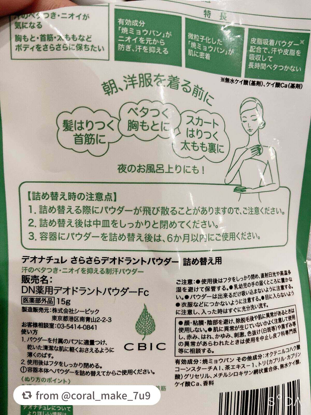 - \11年間ず~っと売上No.1*直ヌリ制汗デオドラントブランド/ 『防臭力のデオナチュレ』シリーズから、ボディ用制汗・防臭パウダー 「薬用デオナチュレ さらさらデオドラントパウダー」 ボディのベタ汗・ムレ・ニオイを防ぐ 合成香料・着色料・アルコール・タルク・防腐剤 無配合 ◆◆汗っかきさん、その胸の谷間のベタ汗は、ニオイの原因に!◆◆ ・胸の谷間、アンダーバストのベタ汗を防いで、ニオイも抑える ・首筋、太もも裏のベタつきにも ◆◆ユーザーから選ばれる理由◆◆ 1.天然アルム石に着目。有効成分「焼ミョウバン」を配合し、汗・ニオイを元から防ぐ! 「薬用デオナチュレ さらさらデオドラントパウダー」は、有効成分「焼ミョウバン」を配合 さらに、皮脂吸収さらさらパウダー**が汗や皮脂を吸収して長時間ベタつかない 2.大判パフで、“直ヌリ”で肌さらさら!さらさら感、続いちゃう! 3.つけるときに、ほんのり香る、天然ゼラニウムの香り ==注意== ●顔・粘膜・陰部を避け、除脱毛直後や肌に異常があるときは使用しないでください。●肌に異常が生じていないかよく注意してご使用ください。また、お肌に合わないとき、使用中に赤み、はれ、かゆみ、刺激、色抜け(白斑等)や黒ずみ等の異常があらわれたときは、使用を中止し、皮フ科専門医等にご相談ください。●使用後はフタをしっかり閉め、直射日光や高温多湿を避けて保管してください。●乳幼児の手の届かないところに置いてください。●パウダーは出来るだけ吸い込まないように注意してください。●衣服などにつかないようにご注意ください。●目にはいらないように注意し、入ったときはすぐに充分に洗い流してください。 【詰め替え時の注意点】 ・パウダーの飛び散りにご注意ください。 ・中皿をしっかりと閉めてください。 ・詰め替え後は、6か月以内にご使用ください。 販売名:DN薬用デオドラントパウダーFc *インテージSRI+制汗剤市場 2013年5月~2024年4月 ソフトストーンW(販売名:デオナチュレソフトストーンEX(リニューアル前処方)・DN薬用スティックFe)累計販売金額 **基剤:無水ケイ酸、基剤:ケイ酸Ca