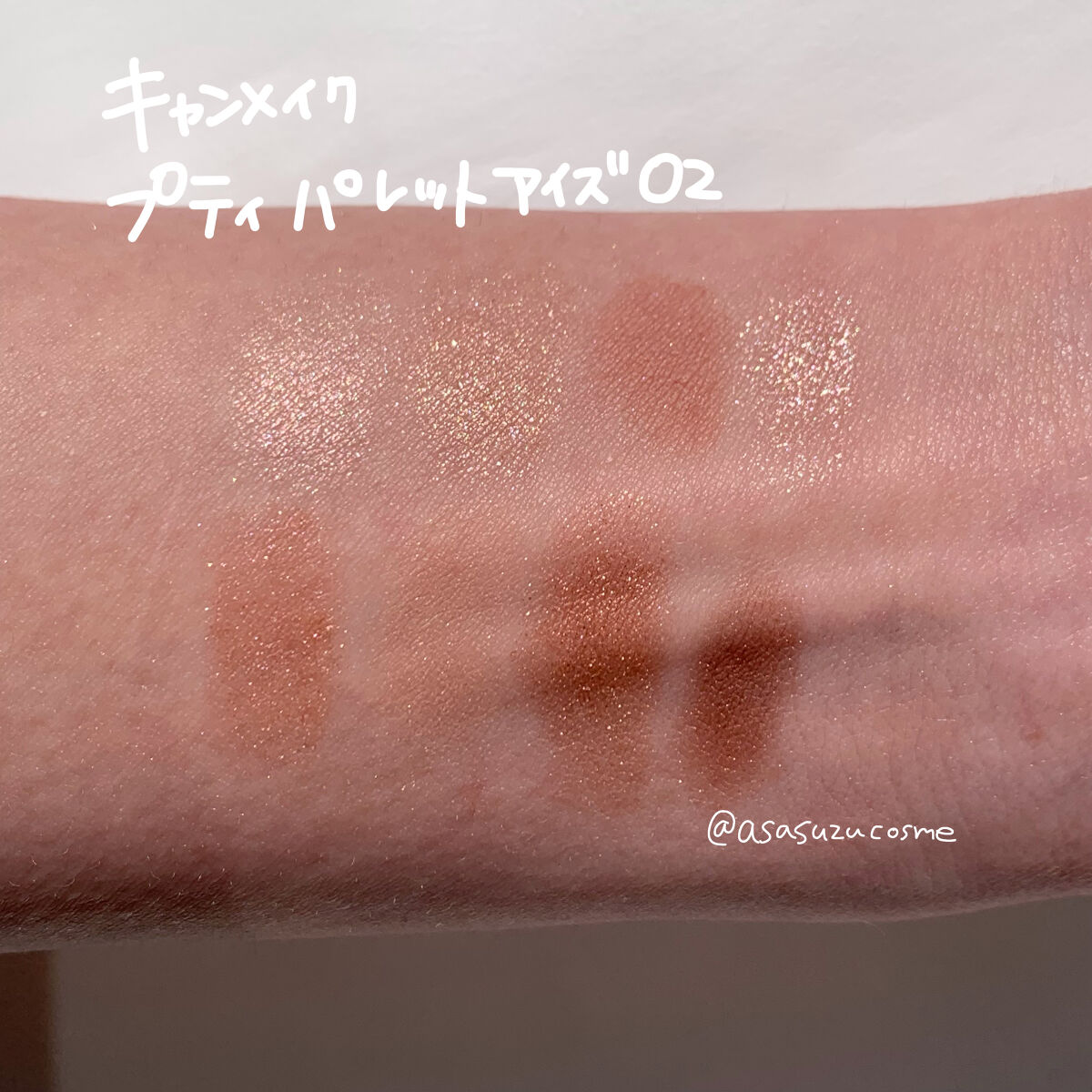 キャンメイクプティパレットアイズ05ストロベリーペシェ最初けっこうラメあるなと思って購入したのですが、チップにとってみると早々にラメは消え、パール質感となりました😌これはこれで良き…上段の右から2番目のムースチョコみたいな色と下段左から2番目...
