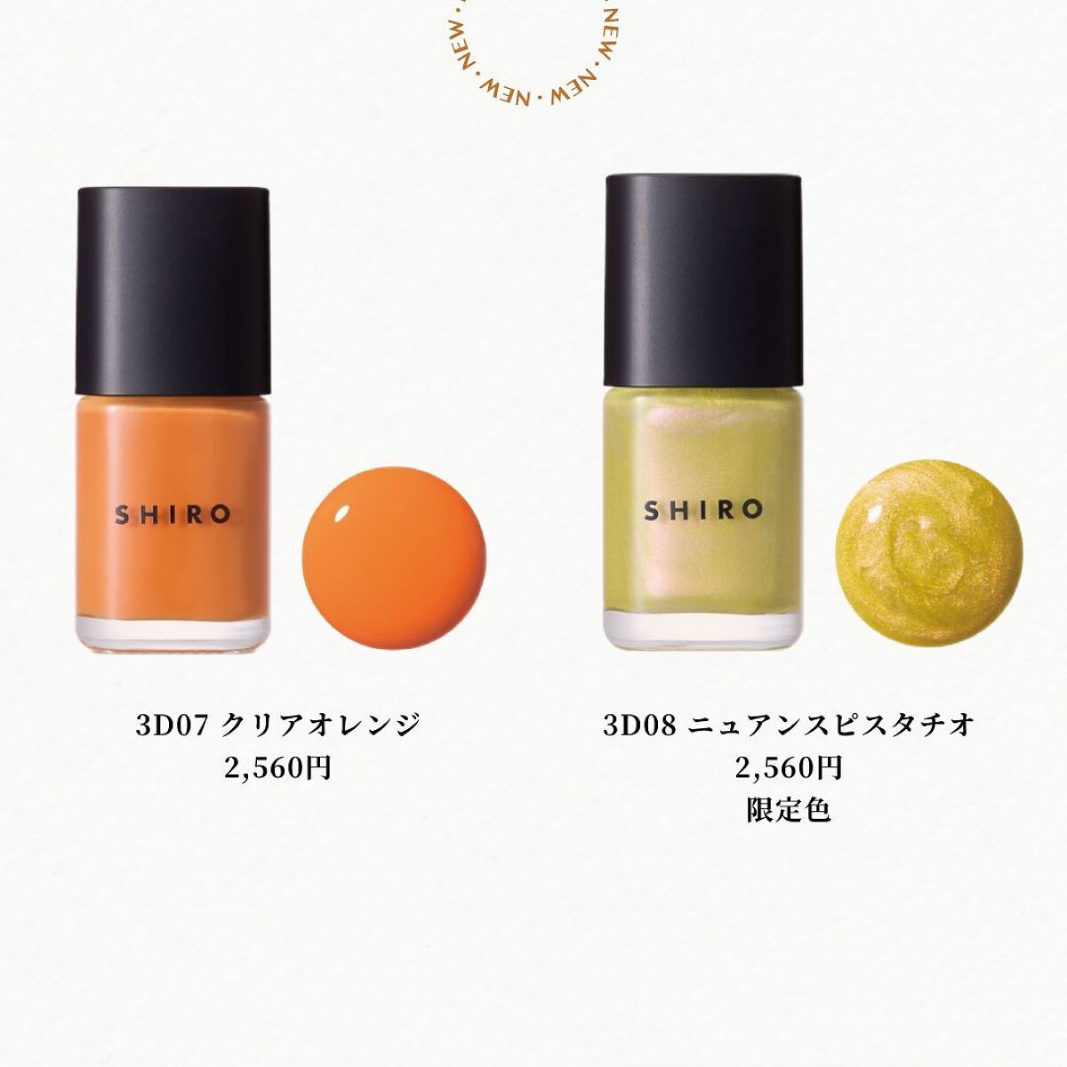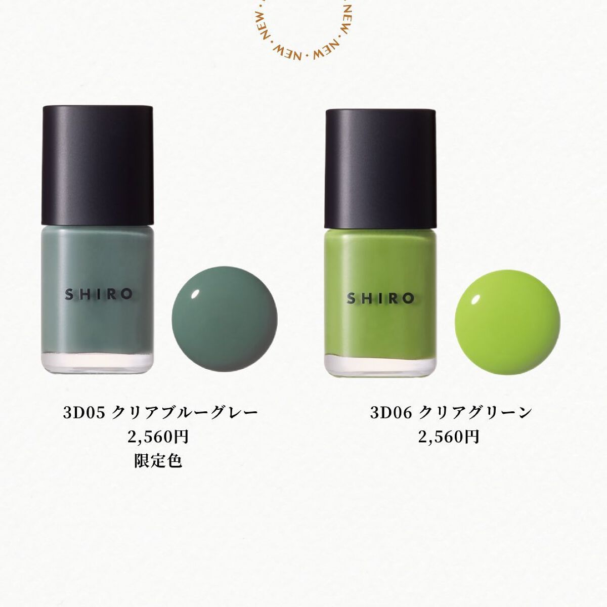 SHIROの亜麻ネイル。2023年春発売の限定カラー。左から・3D02トップコートブルー・3D04マットゴールド・3D05クリアブルーグレー・3D09ニュアンスピンクベージュどの色も素敵過ぎて、眺めるだけで幸せ。SHIROのネイルはカラー展開...