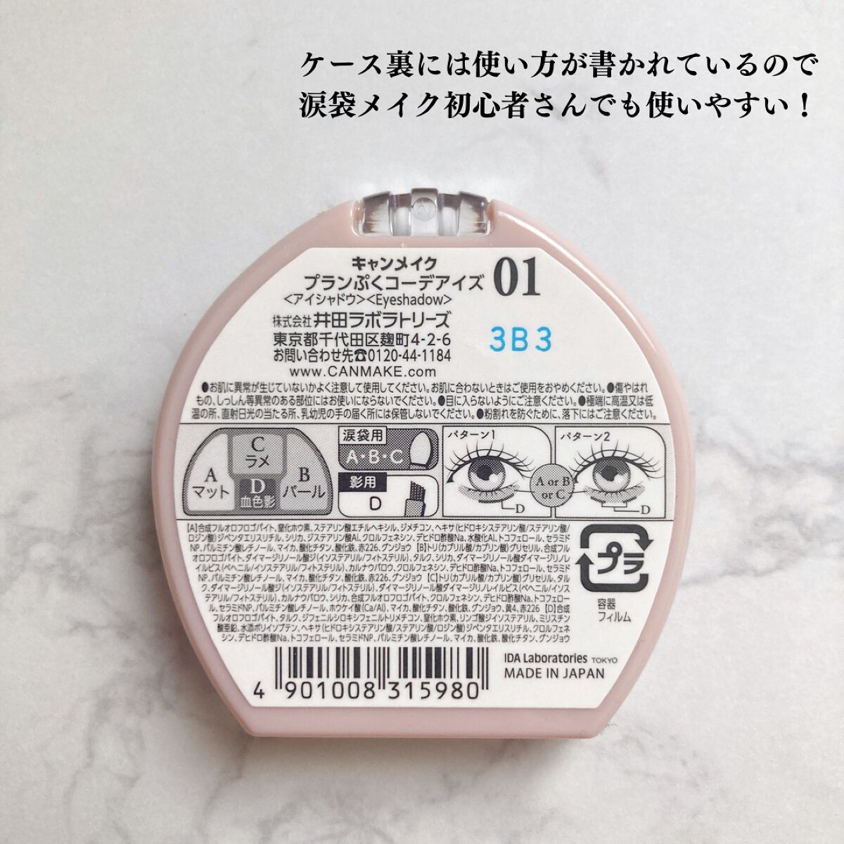- <01 アプリコットプランぷく> 【A】合成フルオロフロゴパイト、窒化ホウ素、ステアリン酸エチルヘキシル、ジメチコン、ヘキサ(ヒドロキシステアリン酸/ステアリン酸/ロジン酸)ジペンタエリスリチル、シリカ、ジステアリン酸Al、クロルフェネシン、デヒドロ酢酸Na、水酸化Al、トコフェロール、セラミドNP、パルミチン酸レチノール、マイカ、酸化チタン、酸化鉄、赤226、グンジョウ 【B】トリ(カプリル酸/カプリン酸)グリセリル、合成フルオロフロゴパイト、ダイマージリノール酸ジ(イソステアリル/フィトステリル)、タルク、シリカ、ダイマージリノール酸ダイマージリノレイルビス(ベヘニル/イソステアリル/フィトステリル)、カルナウバロウ、クロルフェネシン、デヒドロ酢酸Na、トコフェロール、セラミドNP、パルミチン酸レチノール、マイカ、酸化チタン、酸化鉄、赤226、グンジョウ 【C】トリ(カプリル酸/カプリン酸)グリセリル、タルク、ダイマージリノール酸ジ(イソステアリル/フィトステリル)、ダイマージリノール酸ダイマージリノレイルビス(ベヘニル/イソステアリル/フィトステリル)、カルナウバロウ、シリカ、合成フルオロフロゴパイト、クロルフェネシン、デヒドロ酢酸Na、トコフェロール、セラミドNP、パルミチン酸レチノール、ホウケイ酸(Ca/Al)、マイカ、酸化チタン、酸化鉄、グンジョウ、黄4、赤226 【D】合成フルオロフロゴパイト、タルク、ジフェニルシロキシフェニルトリメチコン、窒化ホウ素、リンゴ酸ジイソステアリル、ミリスチン酸亜鉛、水添ポリイソブテン、ヘキサ(ヒドロキシステアリン酸/ステアリン酸/ロジン酸)ジペンタエリスリチル、クロルフェネシン、デヒドロ酢酸Na、トコフェロール、セラミドNP、パルミチン酸レチノール、マイカ、酸化鉄、酸化チタン、グンジョウ <02 サクラプランぷく> 【A】合成フルオロフロゴパイト、窒化ホウ素、ステアリン酸エチルヘキシル、ジメチコン、ヘキサ(ヒドロキシステアリン酸/ステアリン酸/ロジン酸)ジペンタエリスリチル、シリカ、ジステアリン酸Al、クロルフェネシン、デヒドロ酢酸Na、水酸化Al、トコフェロール、セラミドNP、パルミチン酸レチノール、マイカ、酸化チタン、酸化鉄、赤226、グンジョウ 【B】トリ(カプリル酸/カプリン酸)グリセリル、合成フルオロフロゴパイト、ダイマージリノール酸ジ(イソステアリル/フィトステリル)、タルク、シリカ、ダイマージリノール酸ダイマージリノレイルビス(ベヘニル/イソステアリル/フィトステリル)、カルナウバロウ、クロルフェネシン、デヒドロ酢酸Na、トコフェロール、セラミドNP、パルミチン酸レチノール、マイカ、酸化チタン、酸化鉄、グンジョウ、赤226 【C】トリ(カプリル酸/カプリン酸)グリセリル、タルク、ダイマージリノール酸ジ(イソステアリル/フィトステリル)、ダイマージリノール酸ダイマージリノレイルビス(ベヘニル/イソステアリル/フィトステリル)、カルナウバロウ、シリカ、合成フルオロフロゴパイト、クロルフェネシン、デヒドロ酢酸Na、トコフェロール、セラミドNP、パルミチン酸レチノール、ホウケイ酸(Ca/Al)、マイカ、酸化チタン、グンジョウ、酸化鉄、赤226 【D】タルク、合成フルオロフロゴパイト、ジフェニルシロキシフェニルトリメチコン、窒化ホウ素、リンゴ酸ジイソステアリル、ミリスチン酸亜鉛、水添ポリイソブテン、ヘキサ(ヒドロキシステアリン酸/ステアリン酸/ロジン酸)ジペンタエリスリチル、クロルフェネシン、デヒドロ酢酸Na、トコフェロール、セラミドNP、パルミチン酸レチノール、マイカ、酸化鉄、グンジョウ、赤226 <03 ミルクティプランぷく> 【A】合成フルオロフロゴパイト、窒化ホウ素、ステアリン酸エチルヘキシル、ジメチコン、ヘキサ(ヒドロキシステアリン酸/ステアリン酸/ロジン酸)ジペンタエリスリチル、シリカ、ジステアリン酸Al、クロルフェネシン、デヒドロ酢酸Na、水酸化Al、トコフェロール、セラミドNP、パルミチン酸レチノール、マイカ、酸化チタン、酸化鉄、赤226、グンジョウ 【B】トリ(カプリル酸/カプリン酸)グリセリル、合成フルオロフロゴパイト、ダイマージリノール酸ジ(イソステアリル/フィトステリル)、タルク、シリカ、ダイマージリノール酸ダイマージリノレイルビス(ベヘニル/イソステアリル/フィトステリル)、カルナウバロウ、クロルフェネシン、デヒドロ酢酸Na、トコフェロール、セラミドNP、パルミチン酸レチノール、マイカ、酸化チタン、酸化鉄、グンジョウ 【C】トリ(カプリル酸/カプリン酸)グリセリル、タルク、ダイマージリノール酸ジ(イソステアリル/フィトステリル)、ダイマージリノール酸ダイマージリノレイルビス(ベヘニル/イソステアリル/フィトステリル)、シリカ、カルナウバロウ、合成フルオロフロゴパイト、クロルフェネシン、デヒドロ酢酸Na、トコフェロール、セラミドNP、パルミチン酸レチノール、ホウケイ酸(Ca/Al)、マイカ、酸化チタン、酸化鉄、酸化スズ 【D】タルク、合成フルオ