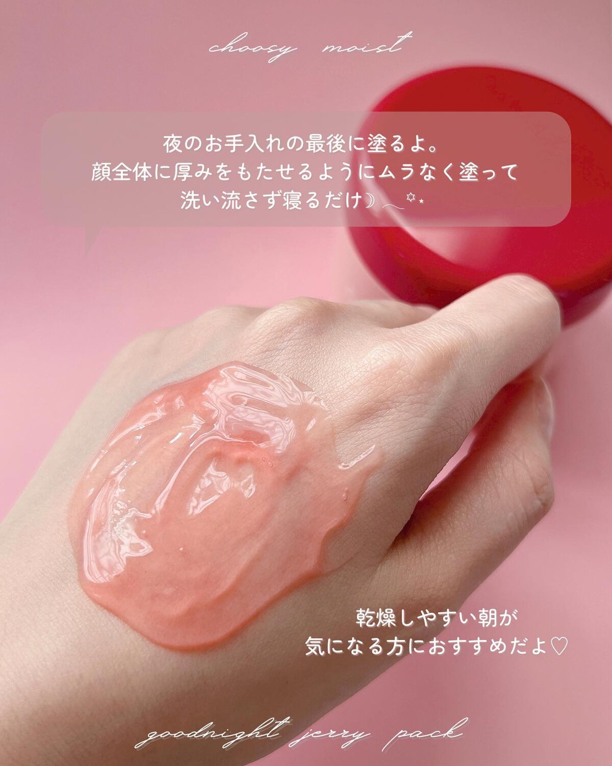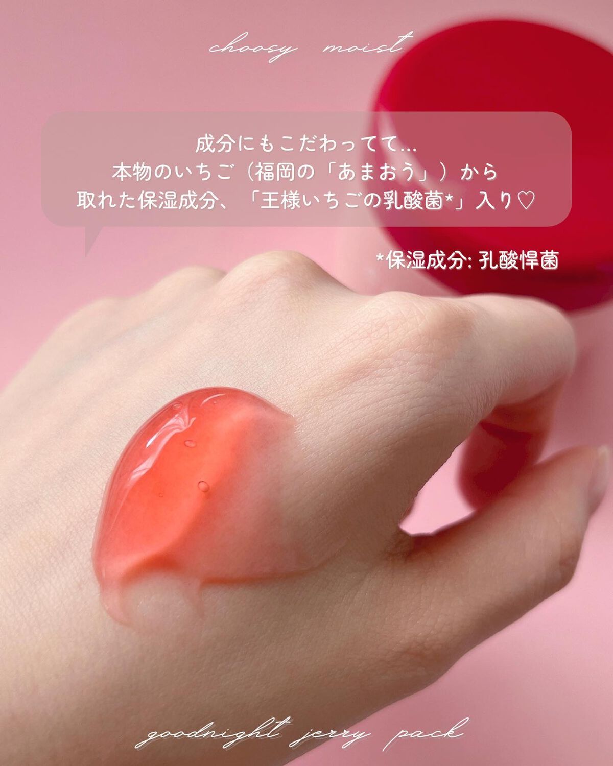 - 肌にのせるとスーッととろけるみずみずしいテクスチャーのジェリーパック。モイストラッピング成分※配合で、寝ている間もぷるぷる集中保湿♡ まるでいちごゼリーのようなキュートな見た目とみずみずしいストロベリーの香り。 ※保湿成分:シロキクラゲ多糖体、ヒアルロン酸Na、セラミドEOP、セラミドNP、セラミドAP