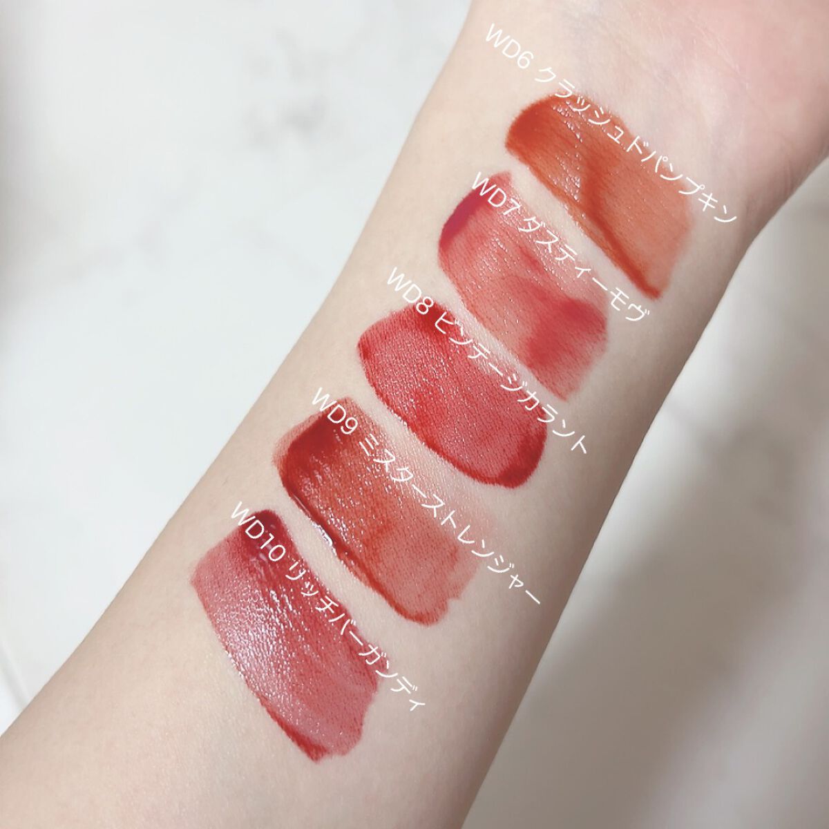 - <WD2 ビトゥン ローズ> 水、ジフェニルジメチコン、リンゴ酸ジイソステアリル、ビスジグリセリルポリアシルアジペート-2、水添ポリイソブテン、ジグリセリン、DPG、セチルPEG/PPG-10/1ジメチコン、イソステアリン酸ソルビタン、ポリソルベート60、ペンチレングリコール、オクチルドデカノール、セテアレス-20、(アクリル酸ヒドロキシエチル/アクリロイルジメチルタウリンNa)コポリマー、スクワラン、フェノキシエタノール、ポリグリセリン-3、ステビオシド、香料、エチルヘキシルグリセリン、グリセリン、シア脂、ツバキ種子油、トリ(カプリル酸/カプリン酸)グリセリル、アルガニアスピノサ核油、ホホバ種子油、アーモンド油、アンズ核油、月見草油、オリーブ果実油、テトラ(ジ-t-ブチルヒドロキシヒドロケイヒ酸)ペンタエリスリチル、カニナバラ果実エキス、マンゴー果実エキス、赤104(1)、赤227、黄5、青1 <WD3 ピンク ヘイズ> 水、ジフェニルジメチコン、リンゴ酸ジイソステアリル、ビスジグリセリルポリアシルアジペート-2、水添ポリイソブテン、ジグリセリン、DPG、セチルPEG/PPG-10/1ジメチコン、イソステアリン酸ソルビタン、ポリソルベート60、ペンチレングリコール、オクチルドデカノール、セテアレス-20、(アクリル酸ヒドロキシエチル/アクリロイルジメチルタウリンNa)コポリマー、スクワラン、フェノキシエタノール、ポリグリセリン-3、ステビオシド、香料、エチルヘキシルグリセリン、グリセリン、水酸化Al、ポリアクリル酸アンモニウム、BG、アルガニアスピノサ核油、シア脂、ツバキ種子油、トリ(カプリル酸/カプリン酸)グリセリル、アーモンド油、アンズ核油、ホホバ種子油、月見草油、オリーブ果実油、テトラ(ジ-t-ブチルヒドロキシヒドロケイヒ酸)ペンタエリスリチル、マンゴー果実エキス、カニナバラ果実エキス、酸化チタン、赤104(1)、赤227、黄5、青1 <WD4 オールウェイズ ヤング> 水、ジフェニルジメチコン、リンゴ酸ジイソステアリル、ビスジグリセリルポリアシルアジペート-2、水添ポリイソブテン、ジグリセリン、DPG、セチルPEG/PPG-10/1ジメチコン、イソステアリン酸ソルビタン、ポリソルベート60、ペンチレングリコール、オクチルドデカノール、セテアレス-20、(アクリル酸ヒドロキシエチル/アクリロイルジメチルタウリンNa)コポリマー、スクワラン、フェノキシエタノール、ポリグリセリン-3、ステビオシド、香料、エチルヘキシルグリセリン、グリセリン、シア脂、ツバキ種子油、トリ(カプリル酸/カプリン酸)グリセリル、アルガニアスピノサ核油、ホホバ種子油、アーモンド油、アンズ核油、月見草油、オリーブ果実油、テトラ(ジ-t-ブチルヒドロキシヒドロケイヒ酸)ペンタエリスリチル、カニナバラ果実エキス、マンゴー果実エキス、赤104(1)、赤227、黄5、青1 <WD6 クラッシュド パンプキン> 水、水添ポリイソブテン、リンゴ酸ジイソステアリル、ビスジグリセリルポリアシルアジペート-2、ジフェニルシロキシフェニルトリメチコン、ジフェニルジメチコン、ポリグリセリン-3、オクチルドデカノール、ポリソルベート60、セチルPEG/PPG-10/1ジメチコン、ラウリン酸ポリグリセリル-10、ペンチレングリコール、1,2-ヘキサンジオール、(アクリル酸ヒドロキシエチル/アクリロイルジメチルタウリンNa)コポリマー、PEG-60水添ヒマシ油、セテアリルアルコール、スクワラン、キシリトール、エチルヘキシルグリセリン、香料、ポリアクリル酸アンモニウム、イソステアリン酸ソルビタン、水酸化Al、フェノキシエタノール、BG、トコフェロール、酸化チタン、酸化鉄、赤227、黄4、黄5、青1 <WD8 ビンテージ カラント> 水、水添ポリイソブテン、リンゴ酸ジイソステアリル、ビスジグリセリルポリアシルアジペート-2、ジフェニルシロキシフェニルトリメチコン、ジフェニルジメチコン、オクチルドデカノール、ポリグリセリン-3、ポリソルベート60、セチルPEG/PPG-10/1ジメチコン、ラウリン酸ポリグリセリル-10、1,2-ヘキサンジオール、ペンチレングリコール、(アクリル酸ヒドロキシエチル/アクリロイルジメチルタウリンNa)コポリマー、PEG-60水添ヒマシ油、セテアリルアルコール、スクワラン、キシリトール、エチルヘキシルグリセリン、香料、イソステアリン酸ソルビタン、トコフェロール、赤104(1)、赤227、黄5、青1 <WD9 ミスター ストレンジャー> 水、水添ポリイソブテン、リンゴ酸ジイソステアリル、ビスジグリセリルポリアシルアジペート-2、ジフェニルシロキシフェニルトリメチコン、ジフェニルジメチコン、オクチルドデカノール、ポリグリセリン-3、ポリソルベート60、セチルPEG/PPG-10/1ジメチコン、ラウリン酸ポリグリセリル-10、1,2-ヘキサンジオール、ペンチレングリコール、(アクリル酸ヒドロキシエチル/アクリロイルジメチルタウリンNa)コポリマー、セテアリルアルコール、PEG-60水添ヒマシ油、スクワラン、キシリトール、エチルヘキシルグリセリン、香料、イソステアリン酸ソルビタン、水酸化Al、ポ
