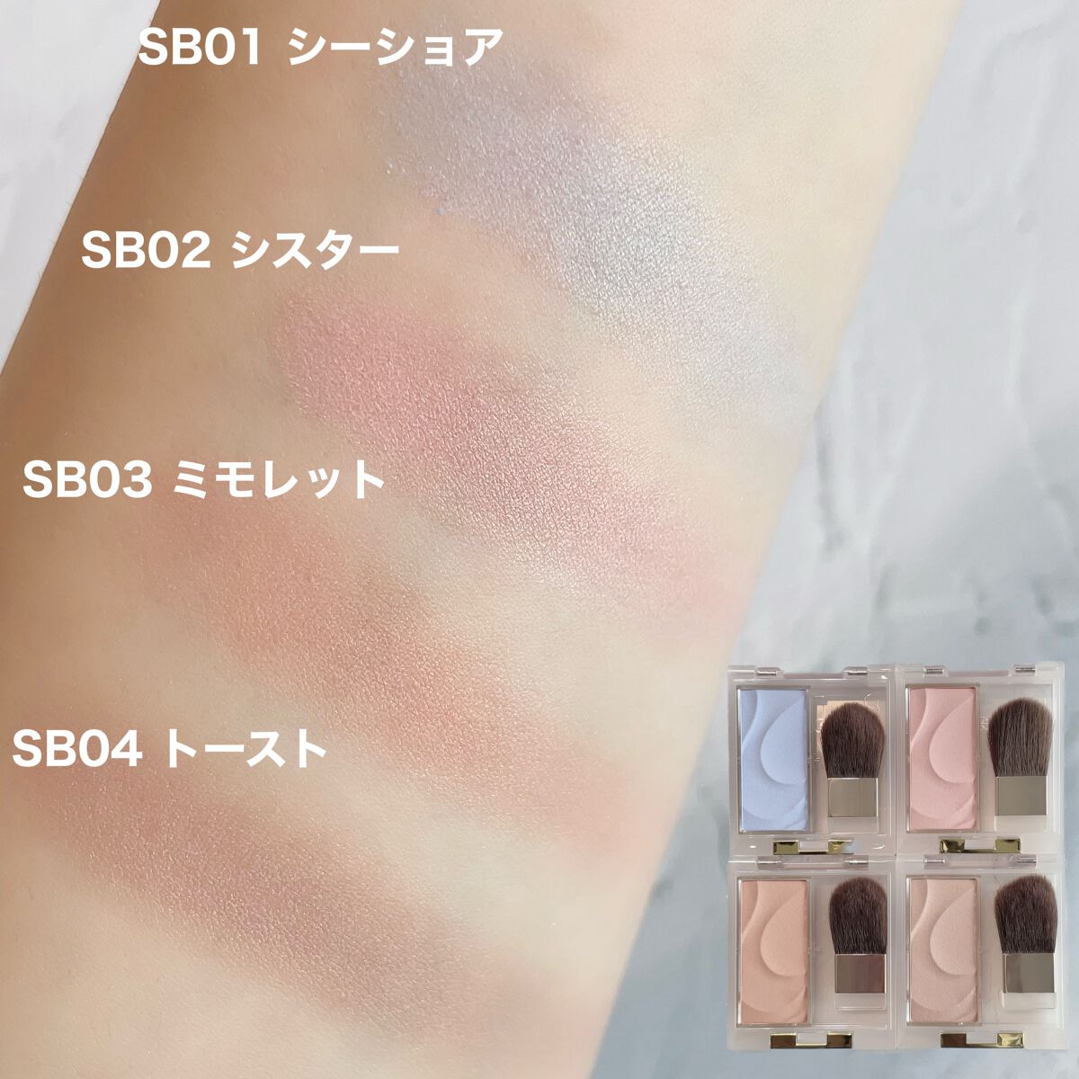 - <SB01 シーショア> タルク、トリエチルヘキサノイン、窒化ホウ素、ポリグリセリル-3ポリジメチルシロキシエチルジメチコン、ラウリン酸亜鉛、トリメチルシロキシケイ酸、メチルトリメチコン、ステアリン酸ソルビタン、セラミドNP、スクワラン、ホホバ種子油、オリーブ果実油、トコフェロール、メチルパラベン、(+/-)グンジョウ、マイカ、酸化チタン、酸化鉄、水酸化Al、赤202、赤226 <SB02 シスター> タルク、トリエチルヘキサノイン、窒化ホウ素、ポリグリセリル-3ポリジメチルシロキシエチルジメチコン、ラウリン酸亜鉛、トリメチルシロキシケイ酸、メチルトリメチコン、ステアリン酸ソルビタン、セラミドNP、スクワラン、ホホバ種子油、オリーブ果実油、トコフェロール、メチルパラベン、(+/-)グンジョウ、マイカ、酸化チタン、酸化鉄、水酸化Al、赤202、赤226 <SB03 ミモレット> タルク、トリエチルヘキサノイン、窒化ホウ素、ポリグリセリル-3ポリジメチルシロキシエチルジメチコン、ラウリン酸亜鉛、トリメチルシロキシケイ酸、メチルトリメチコン、ステアリン酸ソルビタン、セラミドNP、スクワラン、ホホバ種子油、オリーブ果実油、トコフェロール、メチルパラベン、(+/-)グンジョウ、マイカ、酸化チタン、酸化鉄、水酸化Al、赤202、赤226 <SB04 トースト> タルク、トリエチルヘキサノイン、窒化ホウ素、ポリグリセリル-3ポリジメチルシロキシエチルジメチコン、ラウリン酸亜鉛、トリメチルシロキシケイ酸、メチルトリメチコン、ステアリン酸ソルビタン、セラミドNP、スクワラン、ホホバ種子油、オリーブ果実油、トコフェロール、メチルパラベン、(+/-)グンジョウ、マイカ、酸化チタン、酸化鉄、水酸化Al、赤202、赤226 <SB05 ワルツ(限定)> タルク、トリエチルヘキサノイン、ステアリン酸ソルビタン、窒化ホウ素、ポリグリセリル-3ポリジメチルシロキシエチルジメチコン、ラウリン酸亜鉛、トリメチルシロキシケイ酸、メチルトリメチコン、セラミドNP、スクワラン、ホホバ種子油、オリーブ果実油、トコフェロール、メチルパラベン、(+/-)グンジョウ、ホウケイ酸(Ca/Al)、マイカ、金、酸化チタン、酸化鉄、水酸化Al、赤226 <SB06 オーケストラ(限定)> タルク、トリエチルヘキサノイン、ステアリン酸ソルビタン、窒化ホウ素、ポリグリセリル-3ポリジメチルシロキシエチルジメチコン、ラウリン酸亜鉛、トリメチルシロキシケイ酸、メチルトリメチコン、セラミドNP、スクワラン、ホホバ種子油、オリーブ果実油、トコフェロール、メチルパラベン、(+/-)グンジョウ、ホウケイ酸(Ca/Al)、マイカ、金、酸化チタン、酸化鉄、水酸化Al、赤226