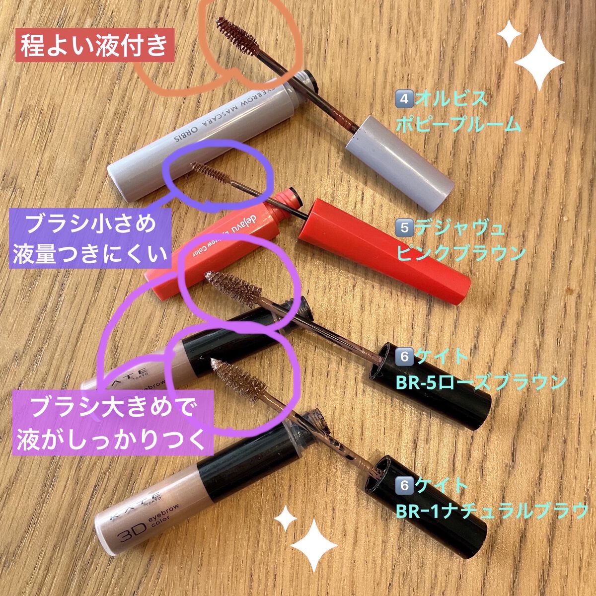 眉マスカラ比較!現在発売されているものです!!○インテグレートニュアンスアイブローマスカラBR773¥880塗りやすさ★★☆☆☆仕上がり ★★★☆☆濃い眉 ★★★☆☆ブラシが太い!○KATE3DアイブロウカラーNBR-2ライトブラウン¥93...