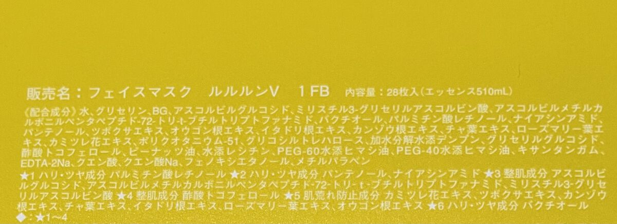- <7枚入> 水、グリセリン、BG、アスコルビルグルコシド、ミリスチル3-グリセリルアスコルビン酸、アスコルビルメチルカルボニルペンタぺプチド-72-トリ-t-ブチルトリプトファナミド、バクチオール、バルミチン酸レチノール、ナイアシンアミド、パンテノール、ツボクサエキス、オウゴン根エキス、イタドリ根エキス、カンゾウ根エキス、チャ葉エキス、ローズマリー葉エキス、カミツレ花エキス、ポリクオタニウム-51、グリコシルトレハロース、加水分解水添デンプン、グリセリルグルコシド、酢酸トコフェロール、ピーナッツ油、水添レシチン、PEG-60水添ヒマシ油、PEG-40水添ヒマシ油、キサンタンガム、EDTA-2Na、クエン酸、クエン酸Na、フェノキシエタノール、メチルパラベン <28枚入> 水、グリセリン、BG、アスコルビルグルコシド、ミリスチル3-グリセリルアスコルビン酸、アスコルビルメチルカルボニルペンタぺプチド-72-トリ-t-ブチルトリプトファナミド、バクチオール、バルミチン酸レチノール、ナイアシンアミド、パンテノール、ツボクサエキス、オウゴン根エキス、イタドリ根エキス、カンゾウ根エキス、チャ葉エキス、ローズマリー葉エキス、カミツレ花エキス、ポリクオタニウム-51、グリコシルトレハロース、加水分解水添デンプン、グリセリルグルコシド、酢酸トコフェロール、ピーナッツ油、水添レシチン、PEG-60水添ヒマシ油、PEG-40水添ヒマシ油、キサンタンガム、EDTA-2Na、クエン酸、クエン酸Na、フェノキシエタノール、メチルパラベン