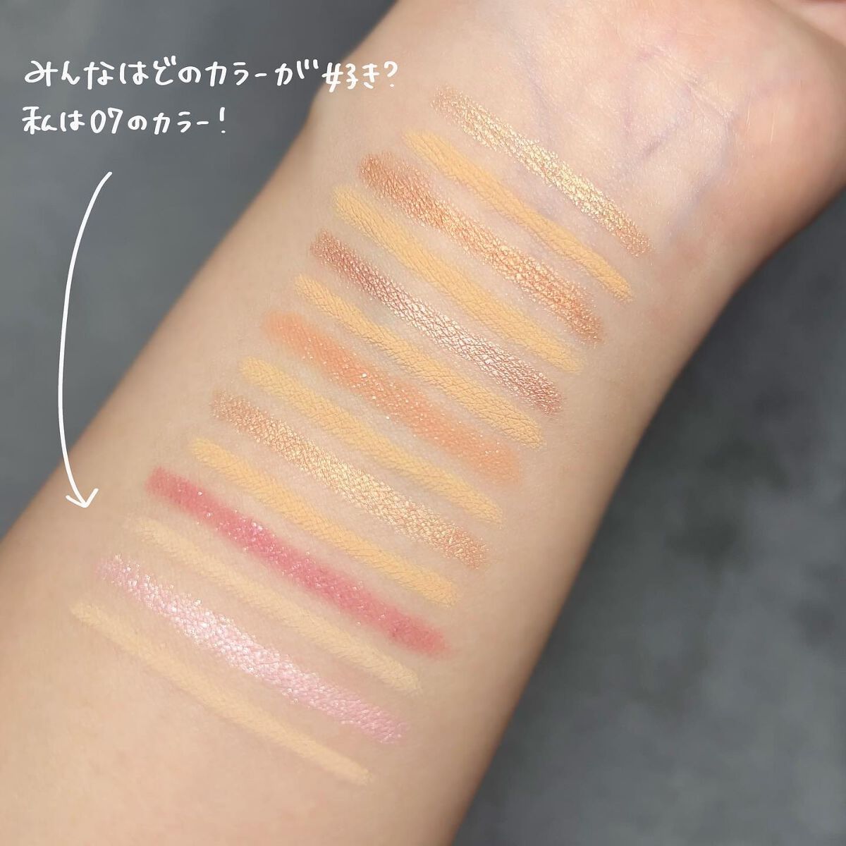 - 涙袋のベースをつくるコンシーラーと、立体感を強調するグリッターの2way仕様! ナチュラルに仕上げたい日はコンシーラーだけを使ったり、なりたい雰囲気に合わせて1本で様々な使い方ができます。なめらかで柔らかい芯は、繊細な目元にやさしくピタッとフィックス。滲みやすい目元もメイクしたてのキレイな涙袋をキープしてくれます。 今回日本で発売となる01、03、04にセットされているウォーム系のコンシーラーは、パーソナルカラー・肌のトーンに縛られず使ってほしいとの思いから、ライトベージュより明るいファンデーションを使うほどの色白の方から、健康的な肌トーンの方までイエベ・ブルべ問わず多数のサンプルを検討し、どんな方にも合いやすいカラーを開発。 さらに04 サーモンベージュはオーバーリップメイクにも使いやすいカラーになっています。ぜひ今韓国で一番トレンドの、ふんわり滲んだようなオーバーリップメイクにもチャレンジしてみてください。 01:ナッシングベージュ/03:エブリシング/04:サーモンベージュ/07:ピンクベイビー ※全7色中 日本発売は上記4色のみ