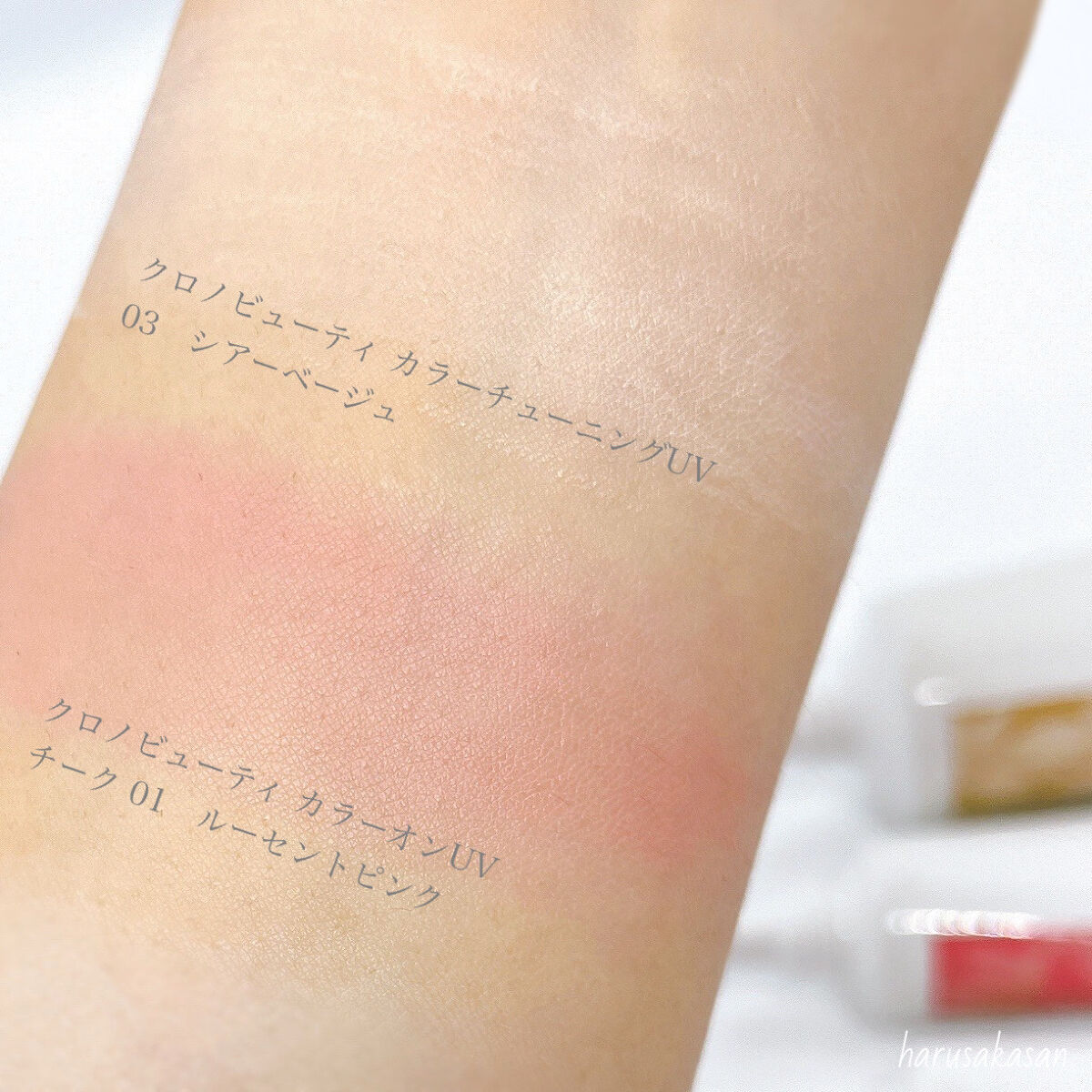 ここまで気持ちよく、日焼け止めということを忘れて塗ったのは初めてかも🤭 SPF50+ PA++++ カラーはニュアンスグリーンなので 肌にのばすと赤みを抑えて、自然な透明感のある艶肌に。 トーンアップ効果もあり、透明感のあるキレイな仕上がりが気に入りました◎ テクスチャーはクリームのようで柔らかく、 スルスルとのびるのが気持ちいいです。 ベタつかず、しっとりとした肌に仕上がります。 クロノビューティ トーンアップUVは香りも良く、のびも良く、トーンアップ下地として使用できてしまう! びっくりするくらい気に入りました👼