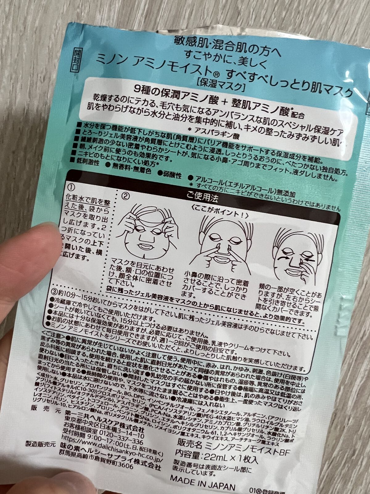 - <ミノン アミノモイスト すべすべしっとり肌マスク> 水、BG、グリセリン、ヒアルロン酸Na、フェノキシエタノール、トコフェロール、グリチルリチン酸2K、アスパラギン酸、アルギニン、グリシン、セリン、アラニン、プロリン、バリン、トレオニン、ヒスチジン、ソメイヨシノ葉エキス、プロパンジオール、DPG、水添レシチン、水酸化Na、ベタイン、PCA-Na、ポリクオタニウム-61、カプリル酸グリセリル、ペンテト酸5Na、1,2-ヘキサンジオール、アーチチョーク葉エキス、ロイシン、ポリメタクリル酸メチル、ラウリン酸ポリグリセリル-10、キウイエキス、(PCA/イソステアリン酸)PEG-40水添ヒマシ油、トリイソステアリン、アミノカプロン酸、エチルへキシルグリセリン、ラウロイルグルタミン酸ジ (フィトステリル/オクチルドデシル)、イソペンチ ルジオール、(アクリレーツ/ア クリル酸アルキル(C10-30))クロスポリマー