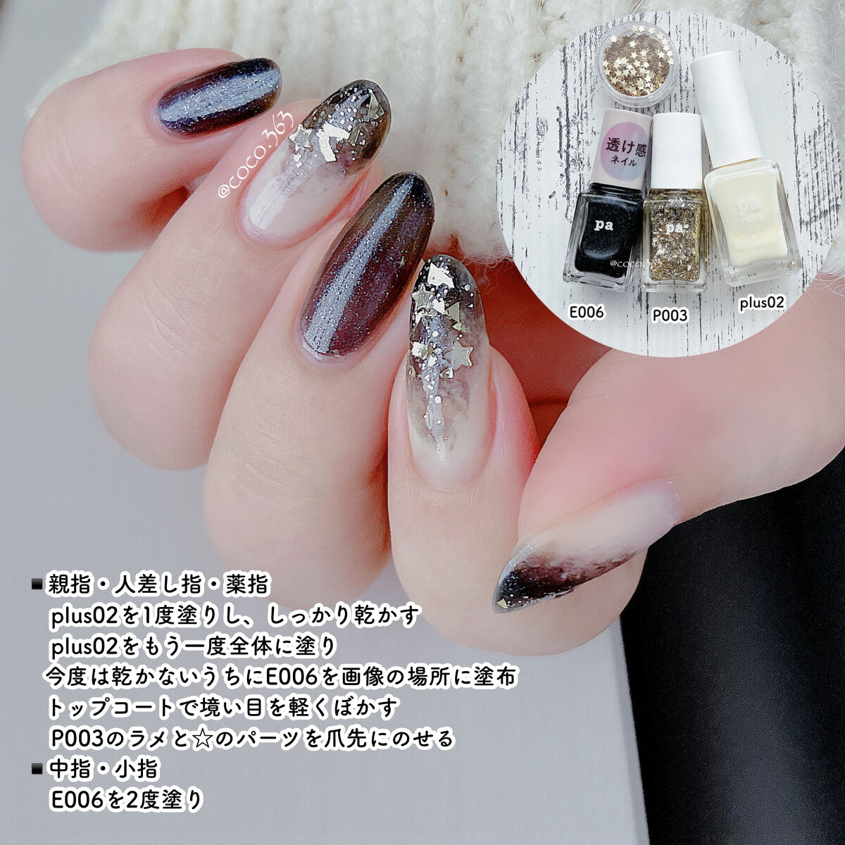 ファンタジーな夜空ネイル🌙【使用ポリッシュ】親指・中指・薬指/ニュアンス塗り◆paネイルカラープレミアムE011親指・中指・薬指・小指/ベースカラー●paネイルカラープレミアAA241親指・小指/爪先ポイント塗り、人差し指ラメグラデ●ちふれネ...