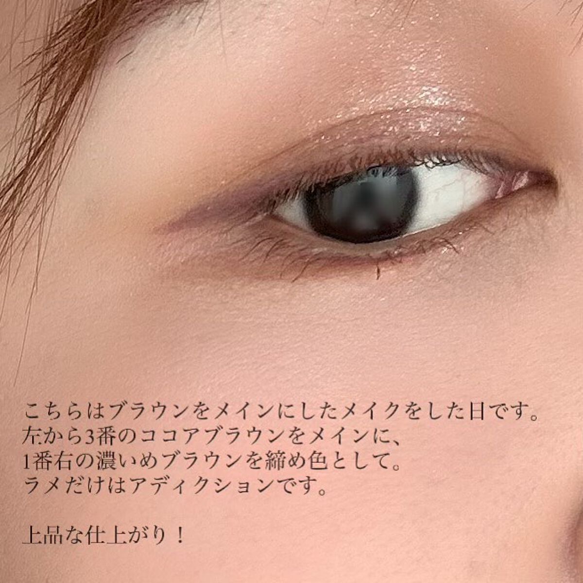 このパレットは、黄味が少なめでブルベにも使いやすいブラウン。 発色はしっかり目だけど、ブラシで調節も可能なので幅広い人に使いやすいパレットだと思います🎀✨ ラメ感も少しずつ異なり、華やかさを抑えたい時は右上を多めに使うと品の良いツヤのあるピンクブラウンメイクになります💎✨ 左上のラメカラーは白っぽいのでどんなアイシャドウとも相性抜群! この可愛い色味と煌びやかなラメは唯一無二です!