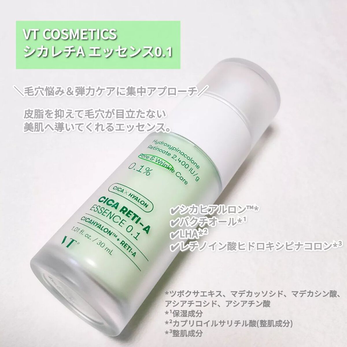 VTCICAレチAエッセンス0.5で、毛穴レスなキメ肌を目指す✨私はレチノールリピ使いなので「中レベル」の0.5%です。私の使用感・効果テクスチャー:みずみずしくて、肌になじませるとべたつきがなくさっぱりとした使い心地がお気に入り。肌の変化:...