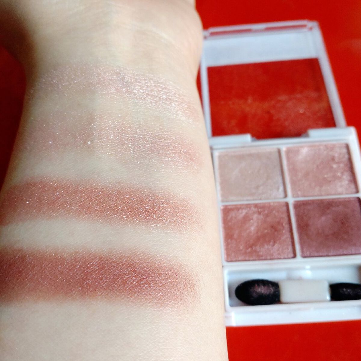 プチプラのクオリティじゃないっ!! 発売前からチェックしていたけれど、ここまで可愛いとは…😆 絶妙カラーで目もとのくすみを飛ばして*明るい印象に🩷 横割りグラデーションでメイクし、立体感をより出したかったので最後に1番左のカラーを上まぶたの真ん中と涙袋にのせています🙆 肌馴染みも良くて粉飛びも感じにくかったです💕 ブラウンの方も店頭に出てたら買おうかな💓