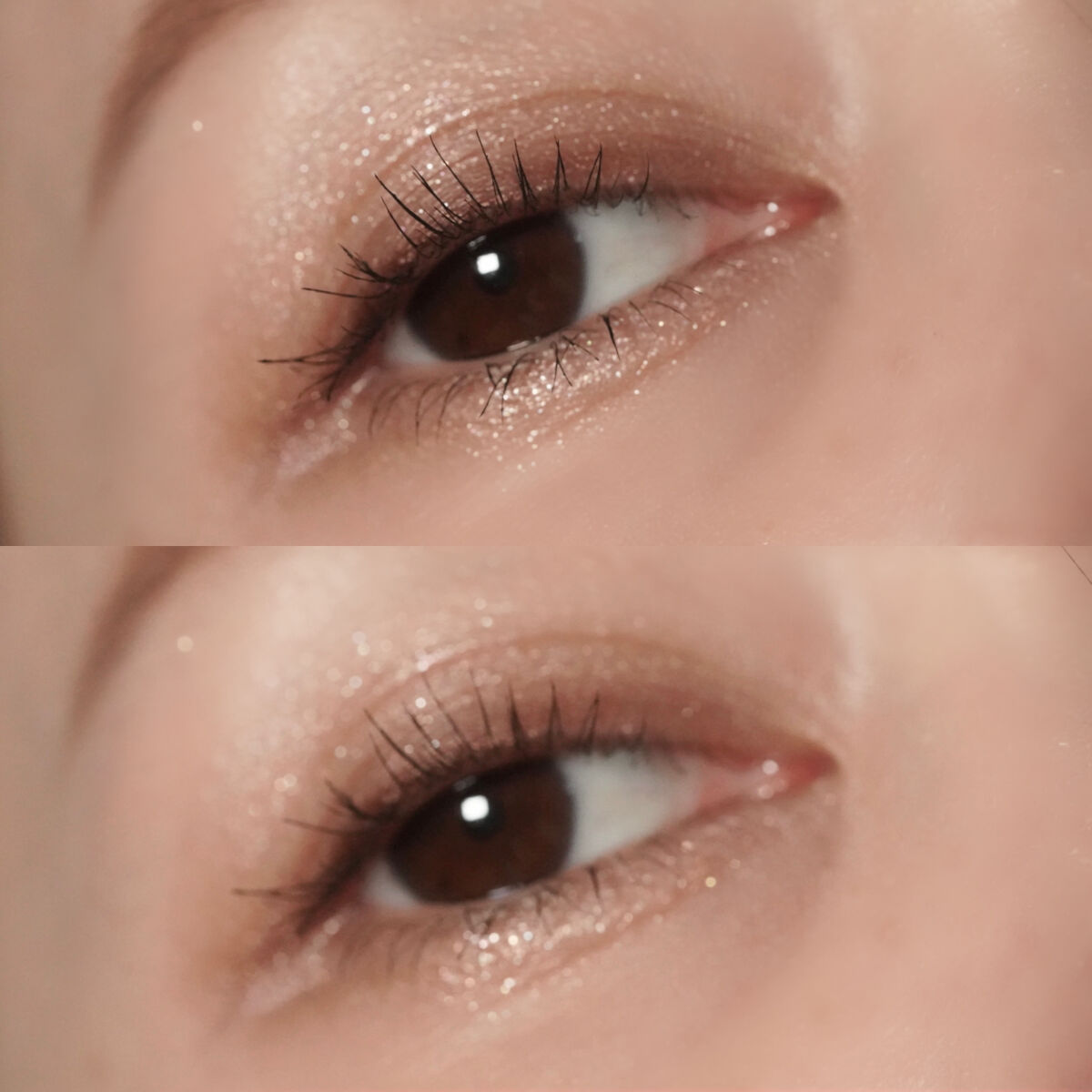よくパレットのなかで明るいカラーをベースにまぶたに広く塗ることが多いのですが、パール感のあるカラーを避ける🙆♀️! パール感たっぷりの明るいカラーは涙袋に使うぐらい光を集めてぷっくり見せてくれるので、まぶたに広く使うと腫れぼったく見えがち😓 目元を明るくみせてくれたり、次に使うアイシャドウをぼかしやすくしてくれるけど、すっ飛ばしてメインのカラーを塗っちゃう✊🏻❤️🔥 涙袋にはたっぷり塗ってぷっくり見せる🙆♀️💕 シルキースフレアイズのマットタイプはすごく優れているな〜と感じました☺️💗 赤やオレンジなどは、入れすぎると腫れぼったく見えやすいので、見せたいカラーは下まぶた目尻にのせて色をたのしむ♡♡ パール感なしの透けマットだけじゃ物足りない… そう感じさせない華やかなラメが左上に入っているので黒目上と涙袋にのせるとすごく可愛い仕上がりに😍! 厄介な左右差のお陰でマットアイシャドウが好きになりました😌💕