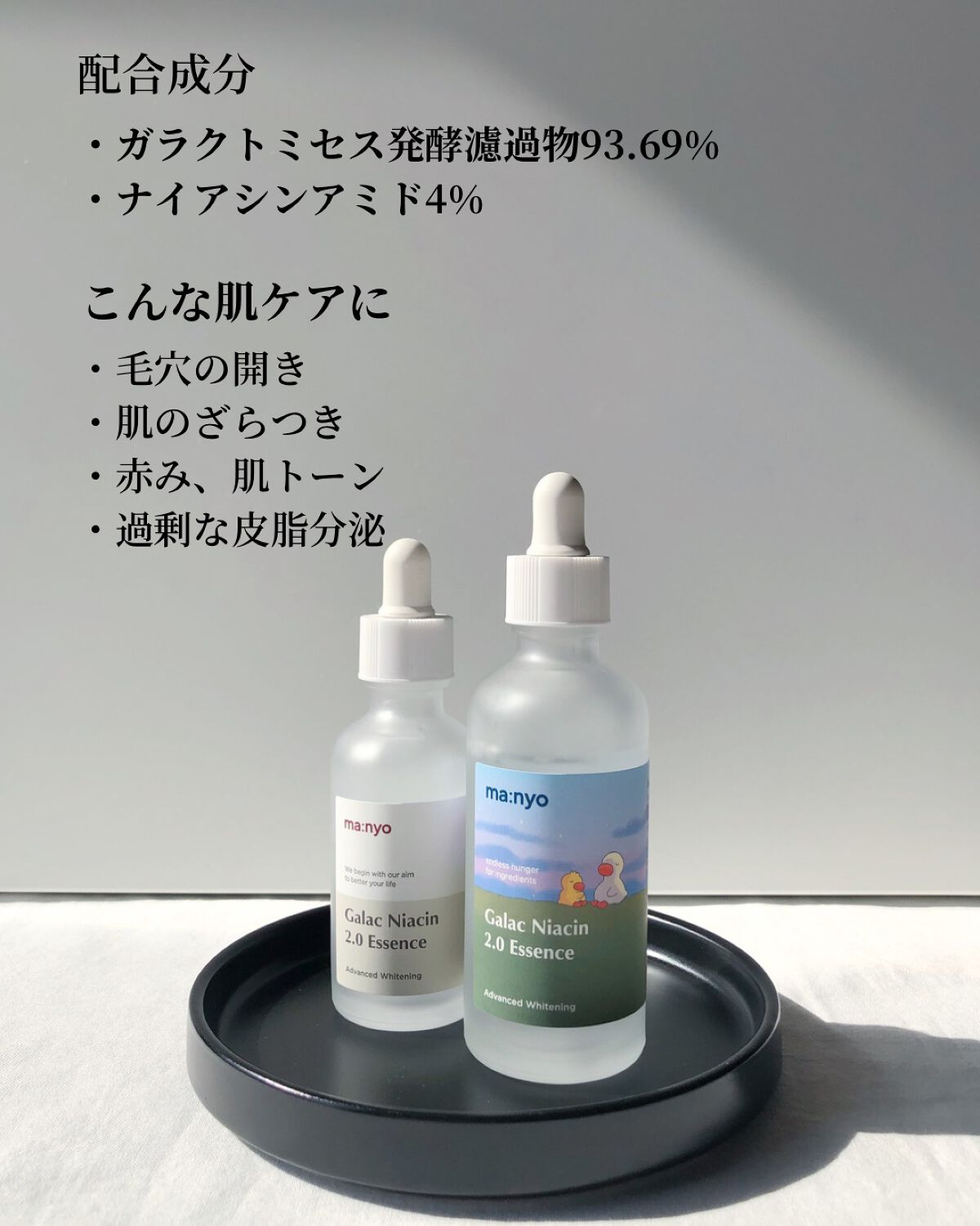 - ビタミン、アミノ酸などの有効成分を豊富に含んだガラクトミセスが93%配合され、皮脂・水分バランスの調節、毛穴ケア、トーンアップケアをサポート。ナイアシンアミド4%配合でメラニンの生成を防ぐ濃縮美容液です。水のような軽いテクスチャーでべたつきません。愛用者からは「2週間で肌の変化を実感した」との声が多く届いています。