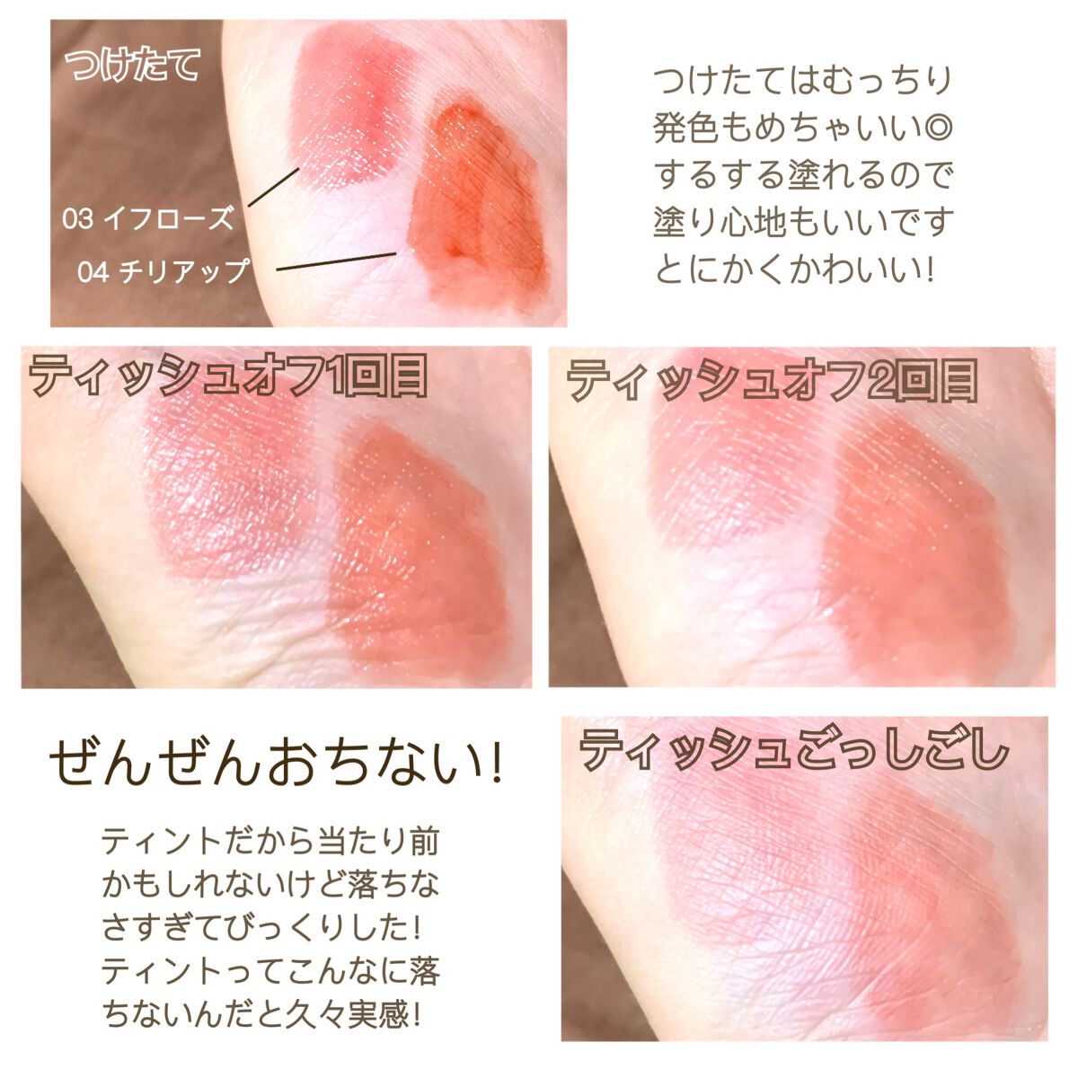 | 口紅・グロス・リップライナーランキング第84位 | 潤いが長続きします! 透け色ですが、重ねればパキッと仕上がるので調整しやすいティントだと思います!! | 詳細を見る |