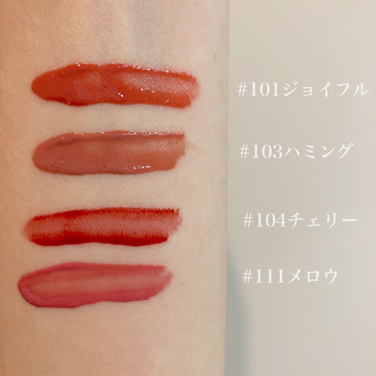 めちゃくちゃ肌馴染みがいいピンクベージュ。ちなみに私はブルベなんだけど全然浮かなくて発色も強すぎずちょうど良くて♯111メロウより好きだった😭💕 塗る前はちょっと白みを感じるんだけど塗ったあとはクリア感も出てめちゃくちゃかわいい! 私が気になってたのは♯101Joyful、♯103Humming、♯111Mellowの3色。
