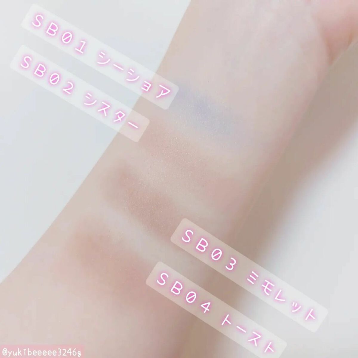 - <SB01 シーショア> タルク、トリエチルヘキサノイン、窒化ホウ素、ポリグリセリル-3ポリジメチルシロキシエチルジメチコン、ラウリン酸亜鉛、トリメチルシロキシケイ酸、メチルトリメチコン、ステアリン酸ソルビタン、セラミドNP、スクワラン、ホホバ種子油、オリーブ果実油、トコフェロール、メチルパラベン、(+/-)グンジョウ、マイカ、酸化チタン、酸化鉄、水酸化Al、赤202、赤226 <SB02 シスター> タルク、トリエチルヘキサノイン、窒化ホウ素、ポリグリセリル-3ポリジメチルシロキシエチルジメチコン、ラウリン酸亜鉛、トリメチルシロキシケイ酸、メチルトリメチコン、ステアリン酸ソルビタン、セラミドNP、スクワラン、ホホバ種子油、オリーブ果実油、トコフェロール、メチルパラベン、(+/-)グンジョウ、マイカ、酸化チタン、酸化鉄、水酸化Al、赤202、赤226 <SB03 ミモレット> タルク、トリエチルヘキサノイン、窒化ホウ素、ポリグリセリル-3ポリジメチルシロキシエチルジメチコン、ラウリン酸亜鉛、トリメチルシロキシケイ酸、メチルトリメチコン、ステアリン酸ソルビタン、セラミドNP、スクワラン、ホホバ種子油、オリーブ果実油、トコフェロール、メチルパラベン、(+/-)グンジョウ、マイカ、酸化チタン、酸化鉄、水酸化Al、赤202、赤226 <SB04 トースト> タルク、トリエチルヘキサノイン、窒化ホウ素、ポリグリセリル-3ポリジメチルシロキシエチルジメチコン、ラウリン酸亜鉛、トリメチルシロキシケイ酸、メチルトリメチコン、ステアリン酸ソルビタン、セラミドNP、スクワラン、ホホバ種子油、オリーブ果実油、トコフェロール、メチルパラベン、(+/-)グンジョウ、マイカ、酸化チタン、酸化鉄、水酸化Al、赤202、赤226 <SB05 ワルツ(限定)> タルク、トリエチルヘキサノイン、ステアリン酸ソルビタン、窒化ホウ素、ポリグリセリル-3ポリジメチルシロキシエチルジメチコン、ラウリン酸亜鉛、トリメチルシロキシケイ酸、メチルトリメチコン、セラミドNP、スクワラン、ホホバ種子油、オリーブ果実油、トコフェロール、メチルパラベン、(+/-)グンジョウ、ホウケイ酸(Ca/Al)、マイカ、金、酸化チタン、酸化鉄、水酸化Al、赤226 <SB06 オーケストラ(限定)> タルク、トリエチルヘキサノイン、ステアリン酸ソルビタン、窒化ホウ素、ポリグリセリル-3ポリジメチルシロキシエチルジメチコン、ラウリン酸亜鉛、トリメチルシロキシケイ酸、メチルトリメチコン、セラミドNP、スクワラン、ホホバ種子油、オリーブ果実油、トコフェロール、メチルパラベン、(+/-)グンジョウ、ホウケイ酸(Ca/Al)、マイカ、金、酸化チタン、酸化鉄、水酸化Al、赤226