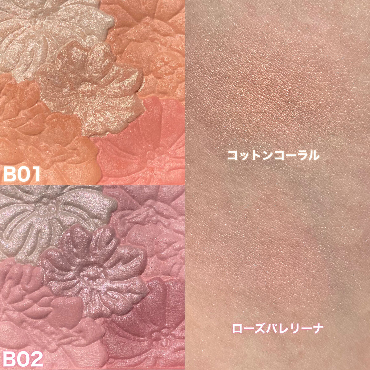 - <B01 コットンコーラル> トリイソステアリン酸ポリグリセリル-2、オクチルドデカノール、リンゴ酸ジイソステアリル、ヘキサ(ヒドロキシステアリン酸/ステアリン酸/ロジン酸)ジペンタエリスリチル、ミリスチン酸亜鉛、メタクリル酸メチルクロスポリマー、(HDI/トリメチロールヘキシルラクトン)クロスポリマー、テトライソステアリン酸ペンタエリスリチル、ビスジグリセリルポリアシルアジペート-2、ペンチレングリコール、フェノキシエタノール、シリカ、メチルパラベン、アルミナ、トコフェロール、ヒドロキシアパタイト、ポリメチルシルセスキオキサン、イソステアリン酸オクチルドデシル、水添ロジン酸ペンタエリスリチル、水、BG、エクトイン、ダマスクバラ花油、カニナバラ果実油、ヒアルロン酸Na、セラミドNP、ノイバラ果実エキス、ザクロ花エキス、トウキンセンカ花エキス、ローズマリー葉エキス、水溶性コラーゲン、ツボクサ葉エキス、タルク、合成フルオロフロゴパイト、酸化チタン、マイカ、酸化鉄、黄4、赤226、酸化スズ、ホホバエステル、トリヒドロキシステアリン <B02 ローズバレリーナ> トリイソステアリン酸ポリグリセリル-2、オクチルドデカノール、リンゴ酸ジイソステアリル、ヘキサ(ヒドロキシステアリン酸/ステアリン酸/ロジン酸)ジペンタエリスリチル、ミリスチン酸亜鉛、メタクリル酸メチルクロスポリマー、(HDI/トリメチロールヘキシルラクトン)クロスポリマー、テトライソステアリン酸ペンタエリスリチル、ビスジグリセリルポリアシルアジペート-2、ペンチレングリコール、フェノキシエタノール、シリカ、メチルパラベン、アルミナ、トコフェロール、ヒドロキシアパタイト、ポリメチルシルセスキオキサン、イソステアリン酸オクチルドデシル、水添ロジン酸ペンタエリスリチル、水、BG、エクトイン、ダマスクバラ花油、カニナバラ果実油、ヒアルロン酸Na、セラミドNP、ノイバラ果実エキス、ザクロ花エキス、トウキンセンカ花エキス、ローズマリー葉エキス、水溶性コラーゲン、ツボクサ葉エキス、タルク、合成フルオロフロゴパイト、マイカ、酸化チタン、酸化鉄、酸化スズ、赤226、ホホバエステル、グンジョウ、トリヒドロキシステアリン、赤202、マンガンバイオレット <B03 ラベンダードリーム> トリイソステアリン酸ポリグリセリル-2、オクチルドデカノール、リンゴ酸ジイソステアリル、ヘキサ(ヒドロキシステアリン酸/ステアリン酸/ロジン酸)ジペンタエリスリチル、ミリスチン酸亜鉛、メタクリル酸メチルクロスポリマー、(HDI/トリメチロールヘキシルラクトン)クロスポリマー、テトライソステアリン酸ペンタエリスリチル、ビスジグリセリルポリアシルアジペート-2、ペンチレングリコール、フェノキシエタノール、シリカ、メチルパラベン、アルミナ、トコフェロール、ヒドロキシアパタイト、ポリメチルシルセスキオキサン、イソステアリン酸オクチルドデシル、水添ロジン酸ペンタエリスリチル、水、BG、エクトイン、ダマスクバラ花油、カニナバラ果実油、ヒアルロン酸Na、セラミドNP、ノイバラ果実エキス、ザクロ花エキス、トウキンセンカ花エキス、ローズマリー葉エキス、水溶性コラーゲン、ツボクサ葉エキス、タルク、合成フルオロフロゴパイト、マイカ、酸化チタン、マンガンバイオレット、グンジョウ、酸化スズ、酸化鉄、赤226、赤202、ホホバエステル、トリヒドロキシステアリン、水酸化Al