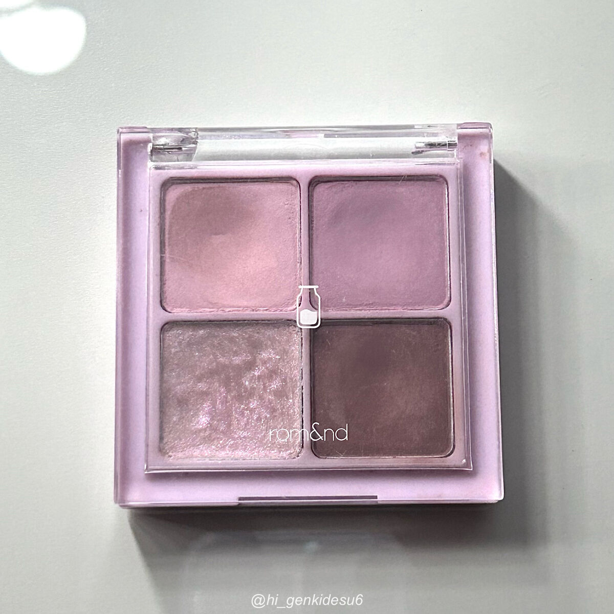 全体的にマットな質感ですが グレージュの色だけ ホワイトパールが入っています。 色味は赤みも黄みも少なく とても使いやすいです。 ロムアンドのアイシャドウは 発色も良く粉質も使いやすいです。