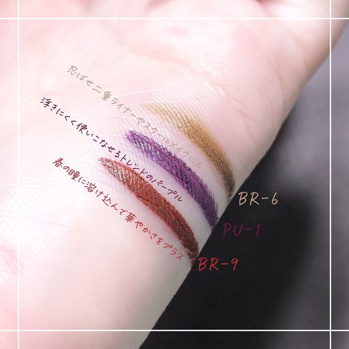 - <BR-1 やわらかな目元に ナチュラルブラウン> 水、アクリレーツコポリマーアンモニウム、BG、1,2-ヘキサンジオール、ベヘネス-30、フェノキシエタノール、ヒドロキシアセトフェノン、カプリリルグリコール、(チタン/酸化チタン)焼結物、AMP、ポリグリセリル-3ジシロキサンジメチコン、クエン酸、シメチコン、PG、ベントナイト、キサンタンガム、センチフォリアバラ花エキス、ラベンダー花エキス、ローヤルゼリーエキス、ラウリン酸ソルビタン、パルミチン酸ソルビタン、トリオレイン酸ソルビタン、ヒアルロン酸Na、カミツレ花エキス、トコフェロール、パルミチン酸スクロース、水添パーム油脂肪酸グリセリズ、アボカドエキス、[+/-]、酸化鉄、カーボンブラック <BR-2 絶妙な目ヂカラ ブラウンブラック> 水、アクリレーツコポリマーアンモニウム、BG、1,2-ヘキサンジオール、ベヘネス-30、フェノキシエタノール、ヒドロキシアセトフェノン、カプリリルグリコール、(チタン/酸化チタン)焼結物、AMP、ポリグリセリル-3ジシロキサンジメチコン、クエン酸、シメチコン、PG、ベントナイト、キサンタンガム、センチフォリアバラ花エキス、ラベンダー花エキス、ローヤルゼリーエキス、ラウリン酸ソルビタン、パルミチン酸ソルビタン、トリオレイン酸ソルビタン、ヒアルロン酸Na、カミツレ花エキス、トコフェロール、パルミチン酸スクロース、水添パーム油脂肪酸グリセリズ、アボカドエキス、酸化鉄、カーボンブラック <BR-3 ほんのり甘い ピーチブラウン> 水、アクリレーツコポリマーアンモニウム、BG、1,2-ヘキサンジオール、ベヘネス-30、フェノキシエタノール、ヒドロキシアセトフェノン、カプリリルグリコール、(チタン/酸化チタン)焼結物、AMP、ポリグリセリル-3ジシロキサンジメチコン、クエン酸、シメチコン、PG、ベントナイト、キサンタンガム、センチフォリアバラ花エキス、ラベンダー花エキス、ローヤルゼリーエキス、ラウリン酸ソルビタン、パルミチン酸ソルビタン、トリオレイン酸ソルビタン、ヒアルロン酸Na、カミツレ花エキス、トコフェロール、パルミチン酸スクロース、水添パーム油脂肪酸グリセリズ、アボカドエキス、酸化鉄、赤226、カーボンブラック <BR-4 明るくヘルシー オレンジブラウン> 水、アクリレーツコポリマーアンモニウム、BG、1,2-ヘキサンジオール、フェノキシエタノール、ベヘネス-30、ヒドロキシアセトフェノン、カプリリルグリコール、AMP、ポリグリセリル-3ジシロキサンジメチコン、クエン酸、シメチコン、PG、ベントナイト、キサンタンガム、センチフォリアバラ花エキス、ラベンダー花エキス、ローヤルゼリーエキス、ラウリン酸ソルビタン、パルミチン酸ソルビタン、トリオレイン酸ソルビタン、ヒアルロン酸Na、カミツレ花エキス、トコフェロール、パルミチン酸スクロース、水添パーム油脂肪酸グリセリズ、アボカドエキス、酸化鉄、赤226、カーボンブラック <BR-5 華やかな印象 レッドブラウン> 水、アクリレーツコポリマーアンモニウム、BG、1,2-ヘキサンジオール、ベヘネス-30、フェノキシエタノール、ヒドロキシアセトフェノン、カプリリルグリコール、AMP、ポリグリセリル-3ジシロキサンジメチコン、クエン酸、シメチコン、PG、ベントナイト、ラウリン酸ソルビタン、パルミチン酸ソルビタン、キサンタンガム、センチフォリアバラ花エキス、ラベンダー花エキス、ローヤルゼリーエキス、トリオレイン酸ソルビタン、ヒアルロン酸Na、カミツレ花エキス、トコフェロール、パルミチン酸スクロース、水添パーム油脂肪酸グリセリズ、アボカドエキス、赤226、コンジョウ、カーボンブラック <BU-1 目元に色っぽさ バーガンディー> 水、アクリレーツコポリマーアンモニウム、BG、1,2-ヘキサンジオール、ベヘネス-30、フェノキシエタノール、ヒドロキシアセトフェノン、カプリリルグリコール、AMP、ポリグリセリル-3ジシロキサンジメチコン、クエン酸、シメチコン、PG、ベントナイト、ラウリン酸ソルビタン、パルミチン酸ソルビタン、キサンタンガム、センチフォリアバラ花エキス、ラベンダー花エキス、ローヤルゼリーエキス、トリオレイン酸ソルビタン、ヒアルロン酸Na、カミツレ花エキス、トコフェロール、パルミチン酸スクロース、水添パーム油脂肪酸グリセリズ、アボカドエキス、赤226、コンジョウ、カーボンブラック <NV-2 ポップなスモーキーブルー> 水、アクリレーツコポリマーアンモニウム、BG、1,2-ヘキサンジオール、フェノキシエタノール、ベヘネス-30、ヒドロキシアセトフェノン、カプリリルグリコール、AMP、ポリグリセリル-3ジシロキサンジメチコン、クエン酸、シメチコン、PG、ベントナイト、ラウリン酸ソルビタン、パルミチン酸ソルビタン、キサンタンガム、センチフォリアバラ花エキス、ラベンダー花エキス、ローヤルゼリーエキス、トリオレイン酸ソルビタン、ヒアルロン酸Na、カミツレ花エキス、トコフェロール、パルミチン酸スクロース、