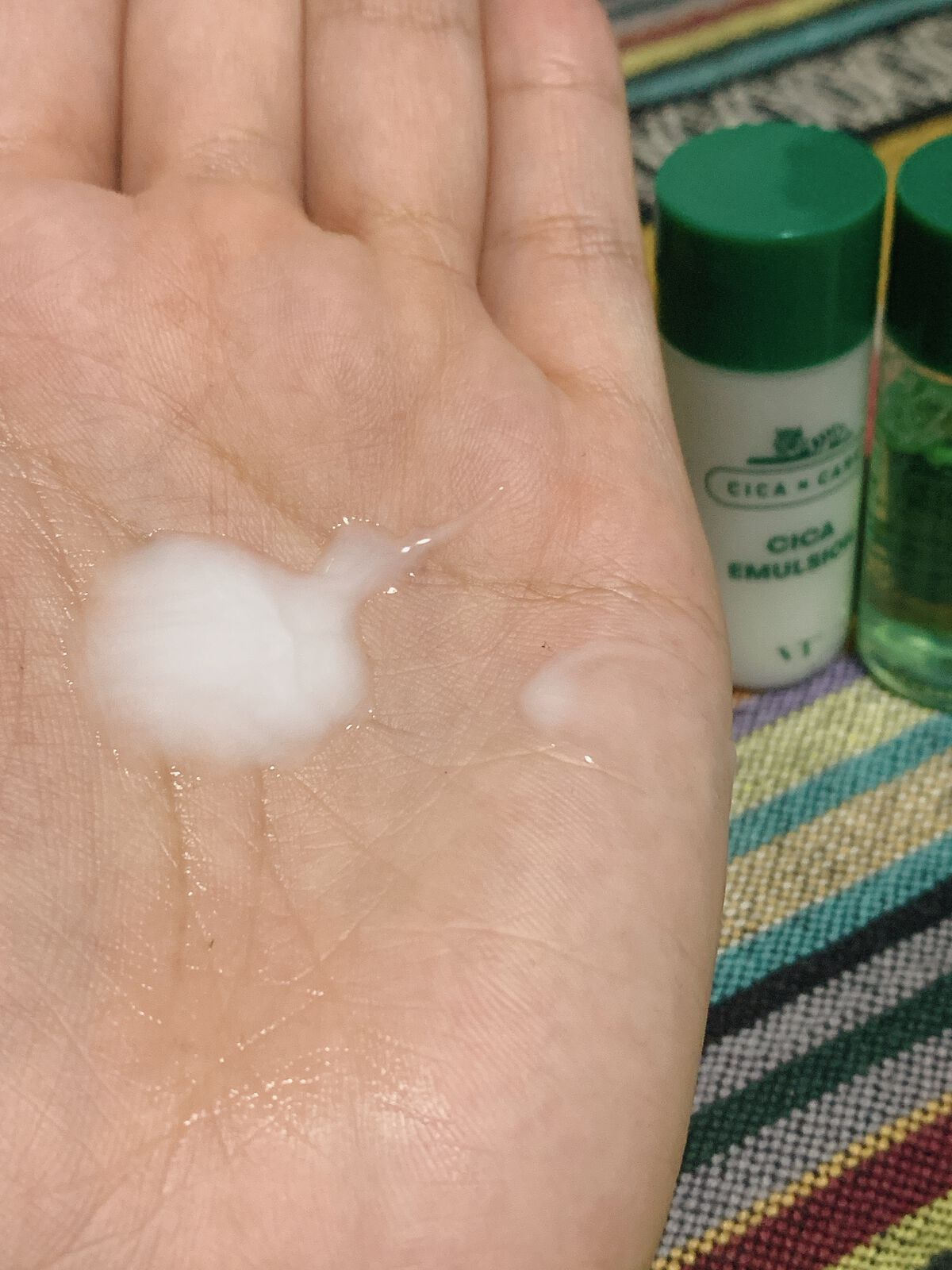 大容量でバシャバシャ使えますね😆 さっぱりした使用感です😃 保湿力もあります! グリーンは自然なグリーンらしいです♪ キレイですね👍 グリーン系の香りがほのかにします🙌 私は好きな香りですが、無香料に慣れている方は気になるかもしれません。つけた瞬間に香り、使用して少しすると気にならなくなります✨ 同じシリーズのCICA エマルジョンと使うと本当に肌がモチモチになります💖