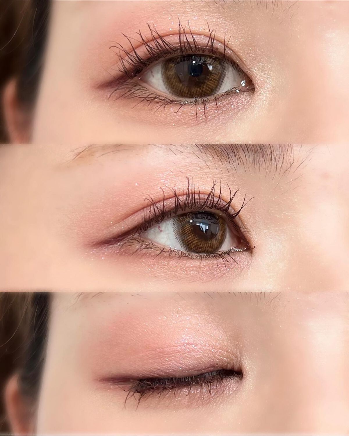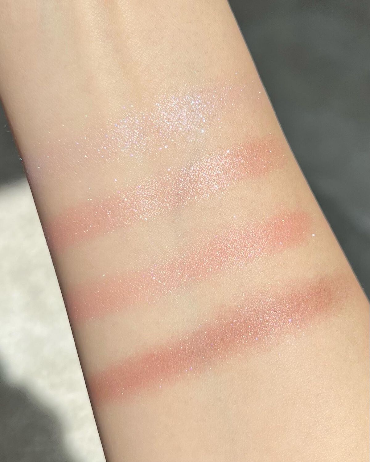 右上のピンクラメをベースに仕込んでメイクしたんだけどツヤと煌めき感えぐすぎる😳💎可愛い、、 そこに右下のカラーを重ねるとじんわり血色感が滲み出るような目元になるよ🦩 これは欠品店舗続出しそう🫣