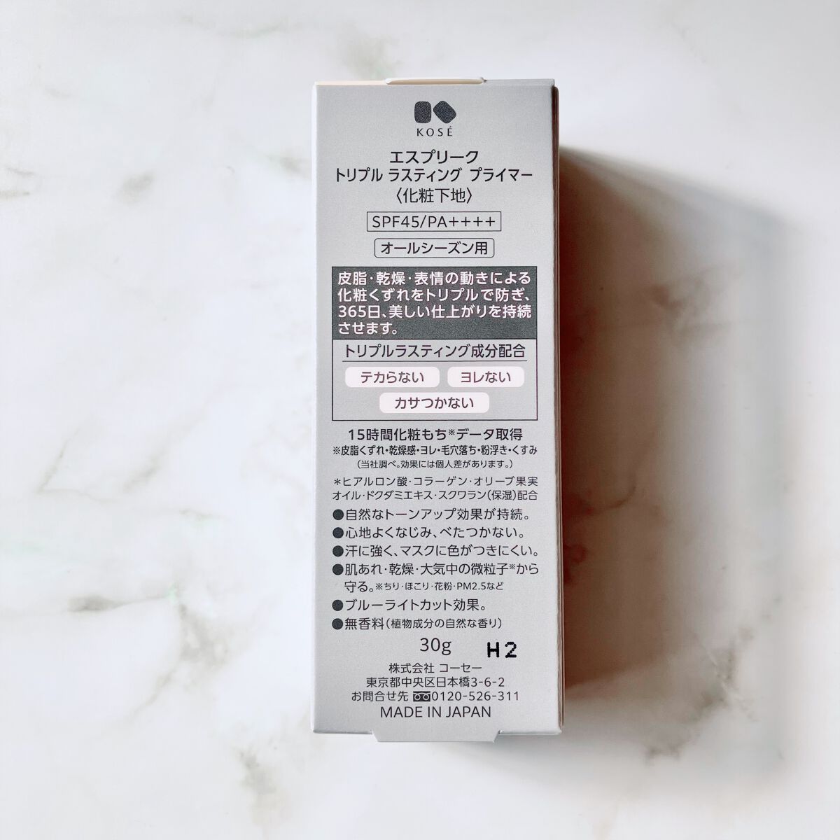 - SPF45 / PA++++ ■ 世界初*の成分アプローチで、皮脂によるテカリ、乾燥によるカサつき、表情の動きによるヨレをトリプルで防ぐ化粧下地です。 優れた化粧もちを叶え、365日、美しい仕上がりを持続させます。 ■トリプルラスティング成分配合。 1日中、テカり・乾燥・ヨレによるくずれを防ぎ、カサつき感もありません。 ■ どんな肌色の方にもなじむ自然なピンクベージュカラーで、自然なトーンアップ効果が持続します。 ■ のび広がりよく心地よくなじむのに、べたつきません。 ■ 汗・水に強く、マスクに色がつきにくい処方です。 ■ 肌あれ・乾燥・大気中の微粒子※から肌を守ります。※ちり・ほこり・花粉・PM2.5など ■ ブルーライトカット効果。 ■ 15時間化粧もちデータ取得※皮脂くずれ・乾燥感・ヨレ・毛穴落ち・粉浮き・くすみ (当社調べ。効果には個人差があります。) ■ オールシーズン用 ■ 無香料(植物成分の自然な香り) ■ パッチテスト済み すべてのかたに皮膚刺激が起きないというわけではありません。 *「皮膜形成性をもつ(ジメチコン/ビニルトリメチルシロキシケイ酸)クロスポリマー」 と「ヒドロキシアパタイト及び酸化亜鉛及び水添レシチンを被覆した粉体」の組合せが世界初先行技術調査及びMintel社データベース内 2022年11月 当社調べ