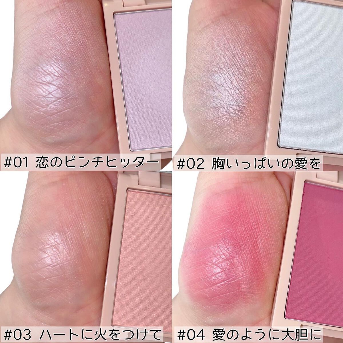 - <01 恋のピンチヒッター> マイカ、ジメチコン、ステアリン酸Mg、ポリメタクリル酸メチル、エチルヘキシルグリセリン、フェノキシエタノール、[+/-]合成フルオロフロゴパイト、トリエトキシカプリリルシラン、タルク、カオリン、シリカ、(HDI/トリメチロールヘキシルラクトン)クロスポリマー、ナイロン-12、酸化スズ、酸化チタン、酸化鉄、マンガンバイオレット、赤201、赤202、青1 <02 胸いっぱいの愛を> マイカ、ジメチコン、ステアリン酸Mg、ポリメタクリル酸メチル、エチルヘキシルグリセリン、フェノキシエタノール、[+/-]合成フルオロフロゴパイト、トリエトキシカプリリルシラン、タルク、カオリン、シリカ、(HDI/トリメチロールヘキシルラクトン)クロスポリマー、ナイロン-12、酸化スズ、酸化チタン、酸化鉄、マンガンバイオレット、赤201、赤202、青1 <03 ハートに火をつけて> マイカ、ジメチコン、ステアリン酸Mg、ポリメタクリル酸メチル、エチルヘキシルグリセリン、フェノキシエタノール、[+/-]合成フルオロフロゴパイト、トリエトキシカプリリルシラン、タルク、カオリン、シリカ、(HDI/トリメチロールヘキシルラクトン)クロスポリマー、ナイロン-12、酸化スズ、酸化チタン、酸化鉄、マンガンバイオレット、赤201、赤202、青1 <04 愛のように大胆に> マイカ、ジメチコン、ステアリン酸Mg、ポリメタクリル酸メチル、エチルヘキシルグリセリン、フェノキシエタノール、[+/-]合成フルオロフロゴパイト、トリエトキシカプリリルシラン、タルク、カオリン、シリカ、(HDI/トリメチロールヘキシルラクトン)クロスポリマー、ナイロン-12、酸化スズ、酸化チタン、酸化鉄、マンガンバイオレット、赤201、赤202、青1