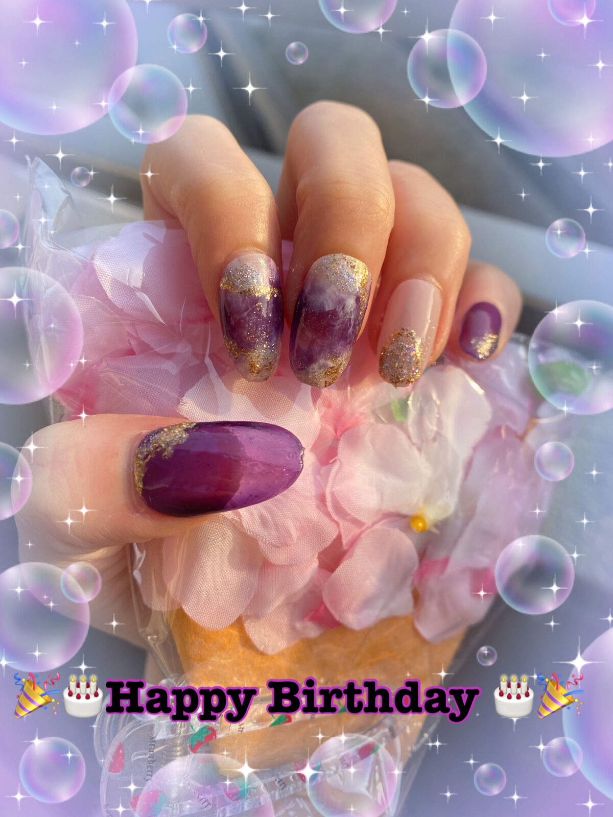 桜さん お誕生日おめでとうございます🎉💕 素敵なお誕生日をお過ごしください🍀*゜ パープルネイルかーわいい🥰💜💜💜 マーブル綺麗に作っていてすごいなぁ🥺💕 チワワーずかわいすぎ😍💕