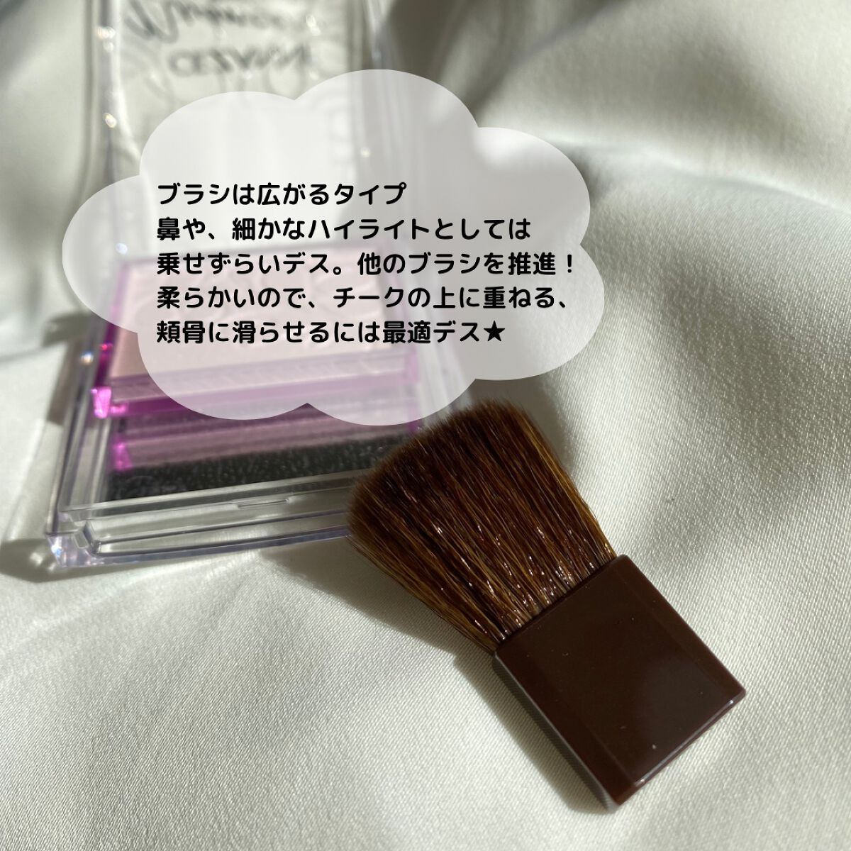 - ほのかな色みと光をレイヤードすることで、まるで光彩ヴェールをまとったようなニュアンスのある頬を演出するハイライト。 高輝度パール配合で面で濡れたような艶肌に。 単品でハイライトやチークとして艶をプラス。 お手持ちのチークやアイシャドウに重ねてニュアンスをチェンジ。 美容保湿成分(ヒアルロン酸Na、カミツレ花エキス、ラベンダー花エキス、ローズマリー葉エキス)配合。 肌あたりの良い毛量たっぷりのブラシ付。