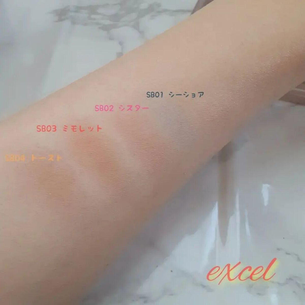 - <SB01 シーショア> タルク、トリエチルヘキサノイン、窒化ホウ素、ポリグリセリル-3ポリジメチルシロキシエチルジメチコン、ラウリン酸亜鉛、トリメチルシロキシケイ酸、メチルトリメチコン、ステアリン酸ソルビタン、セラミドNP、スクワラン、ホホバ種子油、オリーブ果実油、トコフェロール、メチルパラベン、(+/-)グンジョウ、マイカ、酸化チタン、酸化鉄、水酸化Al、赤202、赤226 <SB02 シスター> タルク、トリエチルヘキサノイン、窒化ホウ素、ポリグリセリル-3ポリジメチルシロキシエチルジメチコン、ラウリン酸亜鉛、トリメチルシロキシケイ酸、メチルトリメチコン、ステアリン酸ソルビタン、セラミドNP、スクワラン、ホホバ種子油、オリーブ果実油、トコフェロール、メチルパラベン、(+/-)グンジョウ、マイカ、酸化チタン、酸化鉄、水酸化Al、赤202、赤226 <SB03 ミモレット> タルク、トリエチルヘキサノイン、窒化ホウ素、ポリグリセリル-3ポリジメチルシロキシエチルジメチコン、ラウリン酸亜鉛、トリメチルシロキシケイ酸、メチルトリメチコン、ステアリン酸ソルビタン、セラミドNP、スクワラン、ホホバ種子油、オリーブ果実油、トコフェロール、メチルパラベン、(+/-)グンジョウ、マイカ、酸化チタン、酸化鉄、水酸化Al、赤202、赤226 <SB04 トースト> タルク、トリエチルヘキサノイン、窒化ホウ素、ポリグリセリル-3ポリジメチルシロキシエチルジメチコン、ラウリン酸亜鉛、トリメチルシロキシケイ酸、メチルトリメチコン、ステアリン酸ソルビタン、セラミドNP、スクワラン、ホホバ種子油、オリーブ果実油、トコフェロール、メチルパラベン、(+/-)グンジョウ、マイカ、酸化チタン、酸化鉄、水酸化Al、赤202、赤226 <SB05 ワルツ(限定)> タルク、トリエチルヘキサノイン、ステアリン酸ソルビタン、窒化ホウ素、ポリグリセリル-3ポリジメチルシロキシエチルジメチコン、ラウリン酸亜鉛、トリメチルシロキシケイ酸、メチルトリメチコン、セラミドNP、スクワラン、ホホバ種子油、オリーブ果実油、トコフェロール、メチルパラベン、(+/-)グンジョウ、ホウケイ酸(Ca/Al)、マイカ、金、酸化チタン、酸化鉄、水酸化Al、赤226 <SB06 オーケストラ(限定)> タルク、トリエチルヘキサノイン、ステアリン酸ソルビタン、窒化ホウ素、ポリグリセリル-3ポリジメチルシロキシエチルジメチコン、ラウリン酸亜鉛、トリメチルシロキシケイ酸、メチルトリメチコン、セラミドNP、スクワラン、ホホバ種子油、オリーブ果実油、トコフェロール、メチルパラベン、(+/-)グンジョウ、ホウケイ酸(Ca/Al)、マイカ、金、酸化チタン、酸化鉄、水酸化Al、赤226