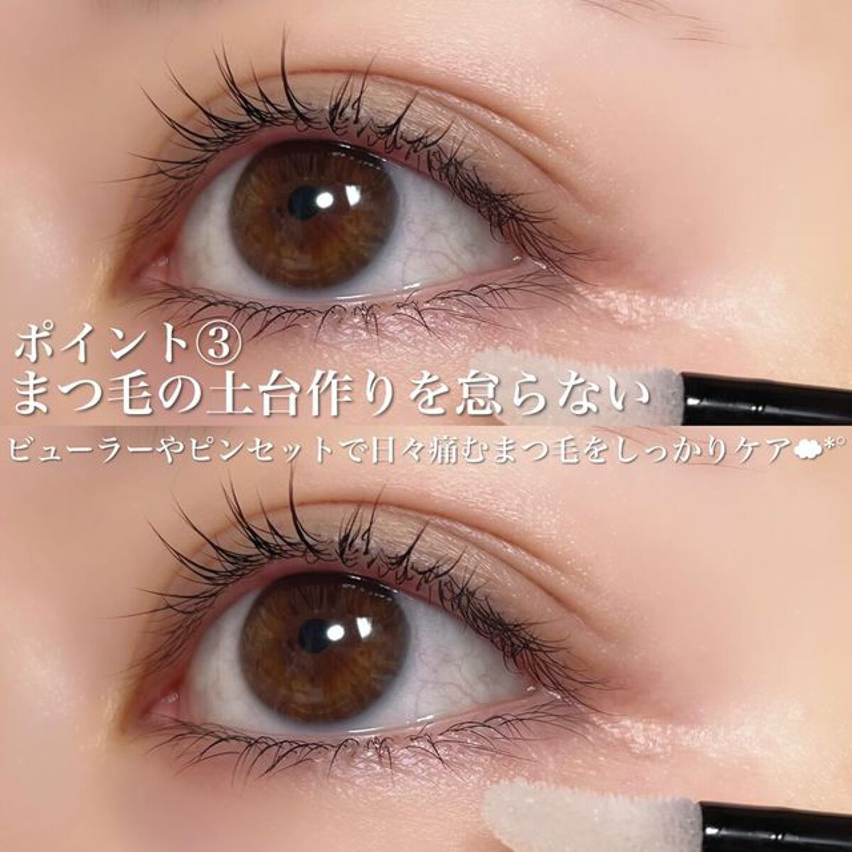 目頭にハイライトを入れてうるみ目に離れ目・遠心顔タイプの方におすすめのポイント!小さい筆でハイライトを目頭に少しだけ塗ると目がうるっと華やかになります👌🏻 下目尻に赤いアイシャドウを入れるなるべく粘膜に近いカラーのアイシャドウがおすすめ自然なタレ目・デカ目が作れます! まつ毛を揃えて束感を出すマスカラを塗った後にピンセットを使って束感のあるまつ毛を作ります︎☽꙳⋆まつ毛の存在感が増してぱっちり目に見えるかも☁°