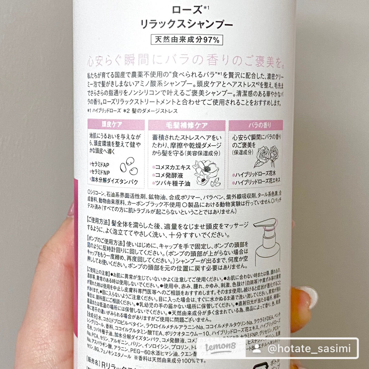 - ・シャンプー 水、コカミドプロピルベタイン、ラウロイルメチルアラニンNa、ココイルメチルタウリンNa、ラウラミドDEA、ペンチレングリコール、香料、ココイルグルタミン酸TEA、ポリクオタニウム-10、ハイブリッドローズ花エキス、ハイブリッドローズ花水、ツバキ種子油、加水分解ダイズタンパク、コメ発酵液、コメヌカエキス、セラミドAP、セラミドNP、グリセリン、PCA-Na、PCA、セリン、アルギニン、バリン、イソロイシン、プロリン、トレオニン、フェニルアラニン、ヒスチジン、グリシン、乳酸Na、アスパラギン酸、アラニン、PEG-60水添ヒマシ油、クエン酸、クエン酸Na、ポリソルベート80、エチルヘキシルグリセリン、BG、フェノキシエタノール ・トリートメント 水、PPG-24グリセレス-24、エチルヘキサン酸セチル、ベヘニルアルコール、グリセリン、プロパンジオール、香料、ステアリルアルコール、テトラエチルヘキサン酸ペンタエリスリチル、セタノール、ペンチレングリコール、ハイブリッドローズ花エキス、ハイブリッドローズ花水、加水分解ダイズタンパク、コメ発酵液、コメヌカエキス、セラミドAP、セラミドNP、ツバキ種子油、オリーブ果実油、水添ホホバ油、ベヘントリモニウムクロリド、ヘキサヒドロキシステアリン酸ジペンタエリスリチル、クエン酸、クエン酸Na、ジステアリルジモニウムクロリド、グアーヒドロキシプロピルトリモニウムクロリド、ステアリン酸PEG-30、ステアリン酸PEG-5、BG、イソプロパノール、フェノキシエタノール、PCA-Na、乳酸Na、アルギニン、アスパラギン酸、PCA、グリシン、アラニン、セリン、バリン、イソロイシン、トレオニン、プロリン、ヒスチジン、フェニルアラニン、イソノナン酸エチルヘキシル ※香料は天然由来成分100%です。 ※BGは植物由来です。(保湿成分)