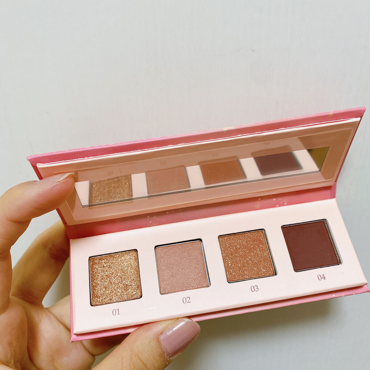 - ①=#4成分:タルク、マイカ、合成フルオロフロゴパイト、酸化チタン、ジエチルヘキサン酸ネオペンチルグリコール、フェニルトリメチコン、ナイロン-12、シリカ、酸化鉄、リンゴ酸ジイソステアリル、ヘキサ(ヒドロキシステアリン酸/ステアリン酸/ロジン酸)ジペンタエリスリチル、ネオペンタン酸イソステアリル、ステアロイルオキシステアリン酸オクチルドデシル、ミリスチン酸Mg、メチルプロパンジオール、ステアリン酸Mg、ポリブテン、プロパンジオール、ステアリン酸ジメチコノール、水添レシチン、ヒドロキシプロピルビスパルミタミドMEA、ジメチコン、メチコン、水、酸化スズ、グンジョウ、カルミン ②=#5成分:マイカ、タルク、ホウケイ酸(Ca/チタン)、ホウケイ酸(Ca/Al)、ステアロイルオキシステアリン酸オクチルドデシル、酸化鉄、フェニルトリメチコン、メタクリル酸メチルクロスポリマー、シリカ、酸化チタン、グンジョウ、リンゴ酸ジイソステアリル、ナイロン-12、メチルプロパンジオール、プロパンジオール、水添レシチン、ハイドロゲンジメチコン、ヒドロキシプロピルビスパルミタミドMEA、ラウロイルリシン、ミリスチン酸Mg、トリエトキシカプリリルシラン、水、酸化スズ、カルミン ③=#7成分:ホウケイ酸(Ca/Al)、マイカ、タルク、ナイロン-12、ジエチルヘキサン酸ネオペンチルグリコール、酸化チタン、酸化鉄、フェニルトリメチコン、ミリスチン酸Mg、ステアリン酸Mg、ホウケイ酸(Ca/Na)、合成フルオロフロゴパイト、リンゴ酸ジイソステアリル、ヘキサ(ヒドロキシステアリン酸/ステアリン酸/ロジン酸)ジペンタエリスリチル、ネオペンタン酸イソステアリル、ステアロイルオキシステアリン酸オクチルドデシル、メタクリル酸メチルクロスポリマー、メチルプロパンジオール、ポリブテン、プロパンジオール、トリエトキシカプリリルシラン、ジメチコン、ラウロイルリシン、水、酸化スズ、銀、カルミン ④=#8成分:マイカ、タルク、マンガンバイオレット、酸化鉄、グンジョウ、メタクリル酸メチルクロスポリマー、シリカ、ジエチルヘキサン酸ネオペンチルグリコール、フェニルトリメチコン、赤226、ミリスチン酸Mg、ナイロン-12、メチルプロパンジオール、リンゴ酸ジイソステアリル、ヘキサ(ヒドロキシステアリン酸/ステアリン酸/ロジン酸)ジペンタエリスリチル、ネオペンタン酸イソステアリル、ステアロイルオキシステアリン酸オクチルドデシル、プロパンジオール、ジメチコン、ポリブテン、水添レシチン、ヒドロキシプロピルビスパルミタミドMEA、トリエトキシカプリリルシラン、水