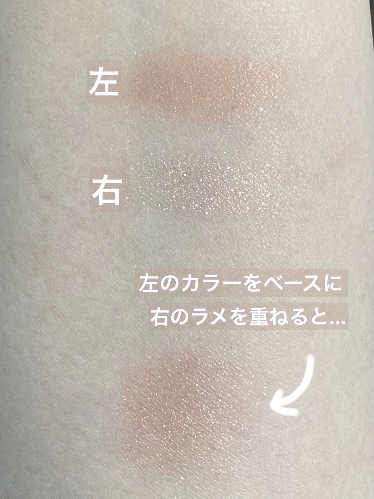 上のクリームベースは目元を自然に明るくします❗️ クリームですが塗るとサラサラでベタつきはありません⸜( •⌄• )⸝ 次に左下のベージュブラウンですが、淡い発色なのに何故か仕上がると立体感がでてくる絶妙な発色です✺ そこで右下のラメカラーの登場です( ¯꒳¯ )b✧ こちらを塗ることで一気に明るさと透明感のあるベージュブラウン(少しオレンジがかっている)に仕上がります٩꒰。•◡•。꒱۶’ ラメを多めにつけると、キラキラとして透明感のある華やかな印象に仕上げてくれるのでこれからの季節にもおすすめですଘ(੭*ˊᵕˋ)੭* ੈ♡‧₊˚